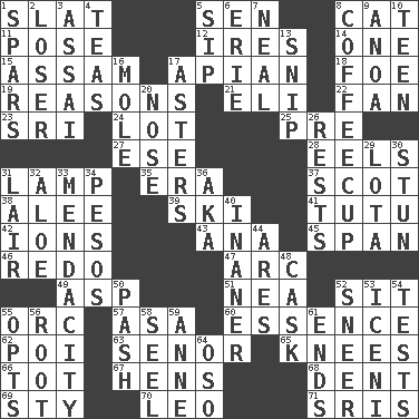 ACROSS 1. Narrow board 5. Elected rep. 8. Domesticated feline 11. Introduce or present, as a question 12. Angers 14. Single 15. Indian state 17. Bee-related 18. Enemy 19. Thinks logically 21. Connecticut Ivy Leaguer 22. Air blower 23. Indian title of respect (Mr.) 24. Car dealer's back yard 25. Before (prefix) 27. Compass dir. 28. Snakelike fish 31. Desk light 35. Epoch 37. Highlander 38. Toward shelter 39. What Jean-Claude Killy likes to do 41. Ballerina skirt 42. Charged particles 43. Santa ___, CA 45. Connect, as a bridge 46. Make new 47. Curve 49. Viper 51. Teachers' org. 52. Be seated 55. The grampus (Milton) 57. White ___ sheet 60. Center 62. Luau course 63. Sir (Sp.) 65. Leg joints 66. Small child 67. Coop moms 68. Gouge 69. Filthy place 70. Lion 71. Indian titles of respect DOWN 1. Practice fights 2. Failure 3. Slender Brazilian palm 4. Afternoon social gatherings 5. Small drink 6. 4th largest of the Great Lakes 7. Anneal 8. Java holder (2 wds.) 9. Small Philippine buffalo 10. Adolescent 13. Clip 16. Undercover agent 17. Michaelmas daisies 20. Olfactory organ 26. Musical pauses 29. Globular water bottle used in Asia 30. Astound 31. Den 32. Medicinal plant 33. Ananias' fault 34. Mexican monetary units 36. Alias (abbr.) 40. More empty; more void 44. Ancient Greek god of war 48. Keg 50. Romantic infatuation 52. Contemptuous expression 53. Ancient Celtic tribe of eastern Britain 54. Trials 55. Chooses 56. Carrot, for example 58. Stitch closed the eyes of (a falcon) 59. Singer Murray 61. Conclusions 64. Bear (Spanish)