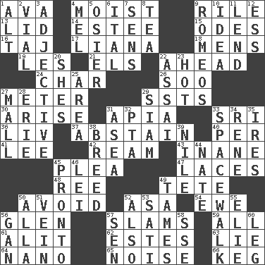 ACROSS 1. Actress Gardner 4. Damp 9. Cause heat under the collar 13. Flaplike covering 14. First name in cosmetics 15. Lyric poems 16. _ Mahal 17. Woody, climbing, usually tropical plant 18. Not women's 19. French article 21. Raised railways 22. Having the leading position 24. Burn to charcoal 26. "Barney Miller" actor Jack 27. Distance measurement 29. Fast planes 30. Ascend 31. Capital of Western Samoa 33. Indian title of respect (Mr.) 36. 54 in ancient Rome 37. Refrain by choice 40. For each 41. Area sheltered from the wind 42. 480, 500 or 516 sheets of paper 43. Lacking in sense or substance 45. Entreaty 47. Shoestrings 48. To separate or throw off 49. False hair 50. Prevent the occurrence of 52. White ___ sheet 54. She-sheep 56. Small, secluded valley 57. Criticizes harshly 59. Everything 61. Came down and settled, as after flight 62. _____ Park, CO 63. Falsehood 64. Billionth: prefix 65. Annoying sound 66. Cask DOWN 1. Keyboard modifier key 2. Small bottle 3. Descriptive word 4. Cartoonist voice _ Blanc 5. Flexible twig of a willow tree 6. Slanted text style (abbr.) 7. Elected reps. 8. Afternoon social gathering 9. Lover boys 10. It may be bright or harebrained 11. Grant temporary use of 12. Double-curved letter 20. "______ My Girl" (Turtles hit) 22. Slender Brazilian palm 23. Being at a high temperature 25. Length times width 27. Shopping center 28. One of the Great Lakes 29. Thailand, formerly 31. At sea 32. Parent Teacher Assoc. 33. High altitude stroll 34. French philosopher Descartes 35. Angers 38. A special lineage 39. Mediterranean tributary 44. Nathan's nickname 45. Right away 46. Luau accessory 49. Domesticates 50. Silent film actress Nazimova 51. Distinctive style or manner 52. In addition 53. Suttee (variant) 55. Writer Wiesel 56. Separate the seeds from cotton 57. Elected rep. 58. Compass dir. 60. Part of a journey