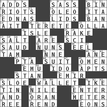 ACROSS 1. Does sums 5. Backtalk 9. Storage container 12. Debaucheries 14. Margarine 15. Call ___ day 16. Ferber et al. 17. Flaplike coverings 18. Bar 19. Small island 20. Cigar-shaped 23. Water jar 24. Capri or Wight 25. Immoral or dissolute person 27. Table seasoning 30. "We ___ not amused" (Victoria) 32. _-fi 33. Saudi Arabian king (1953-1964) 34. Religious women 36. Snakelike fish 38. Scottish cap 39. Compass dir. 40. One (Scot) 43. Parent Teacher Association (abbr.) 46. Set of matching outer garments 48. Presage 49. Australian flightless bird 51. Wedding promise 52. Flats, for short 53. Comedian Laurel of Laurel & Hardy 54. Arab leader 56. A type of plum 58. Place for singles 61. Mamie's mate 64. Metal container 65. Mediterranean tributary 66. Keyboard key 68. Added to 69. Northwest Algerian city 70. Distance measurement 71. Portuguese money of account (variant) 72. Tear apart 73. Immeasurably long periods of time DOWN 1. Type of rug 2. "You Light Up My Life" star Conn 3. Do not 4. R.R. building 5. Not divided or shared with others 6. Set down 7. Spring feasts 8. Mayday 9. God's Word 10. Slanted text style (abbr.) 11. Nanny 13. Fast planes 21. Flair 22. Summer TV shows 23. Migrant worker of the '30s 24. It would 26. Adept person 27. Fast jet (abbr.) 28. Auto club (abbr.) 29. Mass 31. World-weariness 35. A glass for beer 37. Desk light 41. Fish or hair follower 42. Followers of ems 44. Wig 45. Wet nurse (var.) 47. Heavy book 48. Rowing implement 50. Undo the wiring of 53. Message 55. A whole individual unit 56. Play the lead 57. Actor's bit 59. Actor Alda or Thicke 60. Grant temporary use of 61. "Tell ____ the Marines!" 62. Peachy ____! 63. Blunders 65. And not 67. Born