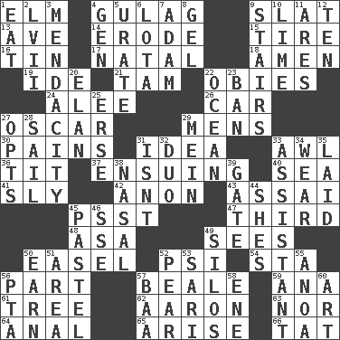 ACROSS 1. Shade tree 4. Russian prison camp 9. Narrow board 13. "___ Maria" 14. Wear away 15. Hoop that covers a wheel 16. Metal container 17. Brizilian seaport 18. So be it 19. Binary compound 21. Scottish cap 22. Off-Broadway awards 24. Toward shelter 26. Automobile 27. Witty Wilde 29. Not women's 30. Aches 31. It may be bright or harebrained 33. Leather borer 36. Teat (slang) 37. Following as a consequence or result 40. Ocean 41. Stealthy 42. Soon (poet.) 43. Slender Brazilian palm 45. Inconspicuous attention getter 47. One of three equal parts 48. White ___ sheet 49. Perceives with the eye 50. Artist's stand 52. 23rd letter of the Greek alphabet 54. R.R. building 56. Piece 57. Calif. Air Force Base 59. Santa ___, CA 61. Relationship diagram 62. Composer Copland 63. And not 64. Of or related to the anus 65. Originate 66. Make lace DOWN 1. Ingest 2. 57 in ancient Rome 3. Ananias' fault 4. Commissioned military rank (abbr.) 5. A salt of uric acid 6. Globular water bottle used in Asia 7. First man 8. Set 9. Flight of steps 10. Citrus frut 11. Ancient Greek god of war 12. "___ Little Indians" 20. Style 22. Sea 23. Prohibit 25. Celtic language 27. Elects 28. Move on water 29. Count _ (2 wds.) 31. Is not 32. Superhero pair 33. Helper 34. Erode 35. Put down 38. Rhinal 39. Yard entry 44. "______ My Girl" (Turtles hit) 45. Soft color 46. Compass dir. 49. Grain storage towers 50. Merit 51. Type of rug 52. Lightbulb-shaped fruit 53. Indian skirt 55. Small Philippine buffalo 56. Parent Teacher Association (abbr.) 57. Sound made by sheep 58. Compass dir. 60. Nonscientific branch of learning