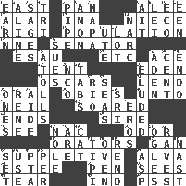 ACROSS 1. 90 degrees 5. Baking dish 8. Toward shelter 12. Having or resembling wings 13. _ tizzy (2 wds.) 14. Sibling's daughter 15. Swiss mountan, "Queen of the Mountains" 16. Census information 19. Compass dir. 20. Legislator 21. He sold his birthright 23. And so on (abbr.) 24. Adept person 27. Portable shelter 30. Genesis locale 31. Motion picture awards 34. Grant temporary use of 35. Of the mouth 38. Off-Broadway awards 40. To (old English) 41. Famous astronaut Armstrong 42. Flew 44. Conclusions 45. Male parent of an animal 46. Perceive with the eye 47. Big _ 50. Aroma 53. Speakers 57. Separate the seeds from cotton 59. Supplying deficiencies 63. Inventor's middle name 64. First name in cosmetics 65. Animal enclosure 66. Perceives with the eye 67. Rend 68. Indiana (abbr.) 69. Inconspicuous attention getter DOWN 1. Merit 2. Place in a line 3. Gurus 4. Three (prefix) 5. Corncob 6. Soon (poet.) 7. California wine valley 8. Small island 9. Luau accessory 10. Environmental prefix 11. Car or cant ending 14. Drug cop 17. Shoshoni 18. Car dealer's back yard 20. Takes to court 22. Ringlike coral islands and reefs 24. An important port of Yemen 25. Penny 26. Inside; within (prefix) 28. Non-commissioned officer (abbr.) 29. Bar bills 30. Dodged 32. _ de Janeiro 33. Oceans 35. Singles 36. French philosopher Descartes 37. Helper 39. Indian title of respect (Mr.) 43. Greek god of love 47. Undercover agent 48. "We ___ not amused" (Victoria) 49. Feline 51. Stares 52. All-night dance parties 54. Native american tent (variation) 55. Baking chamber 56. Tear apart 58. Political cartoonist Thomas 59. Arrange properly for use 60. Purpose 61. Parent Teacher Association (abbr.) 62. For each 63. Viper