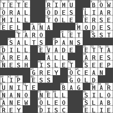 ACROSS 1. False hair 5. Tall New Zealand timber tree 9. Ribbon knot 12. Spoken 13. Lyric poems 14. One who doesn't tell the truth 15. Place where flour is made 16. Lacquered or enameled metalware 17. Celtic language 18. Snakelike fish 19. Santa ___, CA 21. Methods 22. Edible starchy tuberous root 24. Allow 26. Fast jet (abbr.) 27. Table seasonings 28. Zero-star reviews 29. Deli pickle 30. Elude 32. Singer James 36. Type of rug 37. 100% 38. Ancient Greek god of war 39. Tender 40. Small island 42. Ooze 43. Jennifer or Joel 44. Sea 46. Mouth edge 49. Double-curved letter 50. Aureate 51. Join together 53. Container for groceries 54. Impair 57. Billionth: prefix 58. 1994 drama film starring Jodie Foster 61. Grain storage tower 62. Afresh 63. Butter sub 64. Thick slice 65. Marina Del _, California 66. Plate 67. Writer Wiesel DOWN 1. Heavy book 2. 4th largest of the Great Lakes 3. Baron Munchausen's specialties 4. Pipe bend 5. Round or rotation of duties 6. Wedding promise 7. Cartoonist voice _ Blanc 8. Purpose 9. Avian creatures 10. Fertile tracts in a desert 11. Take or capture by force 14. Lion 19. Nonscientific branch of learning 20. Characteristic smell of wine 21. Mountains (abbr.) 23. Assad's deity 24. Dipping utensil 25. Compass dir. 27. Father 28. Friendly 29. Daniel's nick name 31. Flower holders 32. Artist's stand 33. Excercise machine 34. Adolescent 35. Viper 40. Big collection agency 41. Ancient Roman robe 43. Unit of force equal to gravity 45. Gear tooth 46. Type of eclipse 47. Silly 48. Abounding in pines 52. Pull behind 53. Coalition 55. Jai ____ 56. Loose flowing garment 58. Dreamland 59. Biblical high priest 60. French article 61. Compass dir.