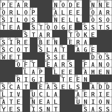 ACROSS 1. Lightbulb-shaped fruit 5. Thickened enlargement 9. Compass dir. 12. Lowest deck of a ship 14. Toward shelter 15. Rowing implement 16. Grain storage towers 17. 1994 drama film starring Jodie Foster 18. Bear (Spanish) 19. Beverage made from leaves 20. Moe Howard, for one 23. Fast planes 24. Play the lead 25. Puff or smoke 27. Male parent of an animal 30. Benjamin's nick name 32. Period 33. Highlander 34. Narrow board 36. Mature 38. Soggy 39. Compass dir. 40. Two (Sp.) 43. Often (poetically) 46. Hearing organs 48. Papal veil 49. Infant locale 51. Area sheltered from the wind 52. So be it 53. Swiss mountan, "Queen of the Mountains" 54. Adolescent 56. Leave at once 58. Artist's stands 61. Find the sum of 64. 54 in ancient Rome 65. Southern CA. univ. 66. Nest on high 68. Had dinner 69. Anneal 70. The state of being joined or united 71. Consenting reply 72. Is not 73. Backtalk DOWN 1. Mail 2. 4th largest of the Great Lakes 3. Silent film actress Nazimova 4. Friend of Pooh 5. Billionth: prefix 6. Cassini of fashion 7. Erase 8. Snakelike fish 9. Trap for birds or small mammals 10. Political cartoonist Thomas 11. Greek god of love 13. Inconspicuous attention getter 21. Bar bills 22. Threatening words 23. Heroin 24. Arrange properly for use 26. Mouth or opening 27. Compass dir. 28. Frozen water 29. Printing process, for short 31. Relating to the nose 35. Cigar-shaped 37. Dutch treat 41. Single 42. Male child 44. Secret move to avoid paying debts 45. Label 47. Stitch closed the eyes of (a falcon) 48. Avid follower 50. Parts 53. All-night dance parties 55. He sold his birthright 56. Kill 57. Quote 59. Actor Alda or Thicke 60. Table seasoning 61. Operatic vocal solo 62. "Vaya con ____" 63. Habitations of wild animals 65. Single; one (prefix) 67. Followers of ems