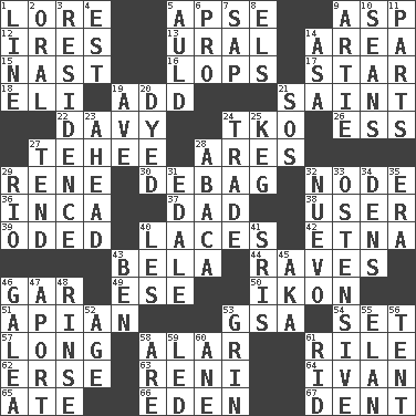 ACROSS 1. Old wives' tales, e.g. 5. Domed church section 9. Viper 12. Angers 13. Mountain range 14. Length times width 15. Political cartoonist Thomas 16. Chops off 17. Play the lead 18. Biblical high priest 19. Increase 21. Inhabitant of Heaven 22. American folk hero Crockett 24. Ring climax 26. Double-curved letter 27. Giggle 28. Ancient Greek god of war 29. French philosopher Descartes 30. Debunk (Brit. slang) 32. Connecting point 36. South American Indian 37. Male parent 38. One who uses or employs something 39. Wrote a lyric poem 40. Shoestrings 42. Inactive volcano in Sicily 43. Actor Lugosi 44. All-night dance parties 46. Slender fish 49. Compass dir. 50. Picture 51. Bee-related 53. Girls' org. (abbr.) 54. Arrange properly for use 57. Yearn 58. Having or resembling wings 61. Cause heat under the collar 62. Celtic language 63. Painter Guido (1575-1642) 64. "Terrible" tsar 65. Had dinner 66. Locale of original sin 67. Undesirable depression on a surface DOWN 1. Actor's bit 2. Of the mouth 3. Dwelling 4. Eastern Standard Time (abbr.) 5. Old (Scot.) 6. Adept person 7. Plant excrement 8. Raised railways 9. Nick name for Arthur 10. Seines 11. Actors' quests 14. White ___ sheet 19. "___ Maria" 20. Colored 21. Distress signal 23. Toward the future 24. Swap 25. Barrel 27. Look after 28. Phillipine bananalike plant 29. _ de Janeiro 31. Peak District village in England 32. New (sp.) 33. Clearly or manifestly demonstrative 34. Lairs 35. Period 40. French article 41. Indian titles of respect 43. Benjamin's nick name 45. Alias (abbr.) 46. An organ shaped like a helmet 47. To the left, to Queeg 48. Remove soap 52. Personal question 53. Smile widely 55. Enthusiasm 56. Portable shelter 58. "We ___ not amused" (Victoria) 59. Directed 60. A saturated hydrocarbon 61. To free from