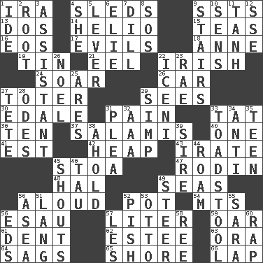 ACROSS 1. Lyricist Gershwin 4. Bobsleighs 9. Fast planes 13. Two (Sp.) 14. Sun: prefix 15. Afternoon social gatherings 16. Greek goddess of the dawn 17. Vices 18. Singer Murray 19. Shallow baking pan 21. Snakelike fish 22. From or relating to Ireland 24. Fly high 26. Automobile 27. Carrier 29. Perceives with the eye 30. Peak District village in England 31. Ache 33. Make lace 36. "___ Little Indians" 37. Deli grouping 40. Single 41. Eastern Standard Time (abbr.) 42. Pile 43. Feeling or showing extreme anger 45. Portico 47. "The Thinker" sculptor 48. Actor Linden 49. Oceans 50. Verbally 52. Plant holder 54. Mountains (abbr.) 56. Son of Isaac 57. 61 cubic inches 59. Boat paddle 61. Gouge 62. First name in cosmetics 63. Mouth or opening 64. Droops 65. Dinah or Pauly 66. Infant locale DOWN 1. Binary compound 2. Carrot, for example 3. Helper 4. A female animal or person 5. Prying instrument 6. Writer Wiesel 7. Deli pickle 8. Mayday 9. Flight of steps 10. Elected reps. 11. Hyperbolic tangent 12. Compass dir. 20. Christmas carol 22. Ancient Celtic tribe of eastern Britain 23. Actress Charlotte 25. Ancient Greek god of war 27. Wig 28. Lyric poems 29. Simple or foolish person 31. Entreaty 32. Auto club (abbr.) 33. Inedible or poisonous agaric 34. Opposed to 35. Adolescent 38. Hold, grip (Informal) 39. Title for a man of rank and authority 44. Wander aimlessly 45. Yells 46. The 19th letter of the Greek alphabet 49. Guide 50. At sea 51. Austrian-born American filmmaker Fritz 52. Expression of disdain 53. Von Bismarck 55. "Two Mules for Sister ____" 56. Begley and Asner 57. French article 58. To separate or throw off 60. Reproach for some lapse or misdeed