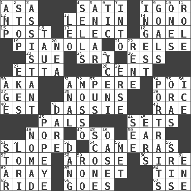 ACROSS 1. White ___ sheet 4. Suttee (variant) 8. Composer Stravinsky 12. Mountains (abbr.) 13. Soviet premier 1918-24 14. Words to Nanette 15. Mail 17. Choose 18. Highlander 19. Player piano 21. Threatening words 23. Take to court 24. _ Lanka 26. Curvy letter 27. Singer James 28. Penny 30. Alias (abbr.) 31. Electrical Unit 34. Luau course 37. Commissioned military rank (abbr.) 38. Parts of speech 39. The grampus (Milton) 40. Eastern Standard Time (abbr.) 41. Small ungulate mammals of Africa 42. Actress Charlotte 43. Friends 44. Arranges properly for use 46. Not either 47. Bear (Spanish) 50. Ewer handle 51. Inclined 54. Devices for capturing images 57. Heavy book 58. Came up 60. Beget 62. Like ___ of sunshine 63. Music written for nine 64. Metal container 65. Travel on or in a vehicle 66. Leaves 67. Compass dir. DOWN 1. Electrical Unit 2. Obstruct or block passage 3. Helper 4. Exchanges for money 5. Approach 6. Nervous spasm 7. To the inside or interior of 8. Eat 9. Finish lines 10. Washington bills 11. Hero or heavy, e.g. 13. Lion 16. Strained 20. Teachers' org. 22. French philosopher Descartes 25. Ancient Celtic tribe of eastern Britain 27. Supplements with great effort 29. Celtic language 30. Personal question 31. Of or related to the anus 32. With motion or animation 33. Product of festering 34. Likenesses of persons 35. Mouths or openings 36. Frozen water 41. Have the gumption 43. Wimpy's pal 44. Observe 45. Hearing organs 46. Roamer 48. Biscuitlike quick bread 49. Fertile tracts in a desert 51. Play the lead 52. Australian parrot (variant) 53. Mild oath, euphamism for damn 55. Was introduced to 56. Indian titles of respect 59. Friend of Pooh 61. Compass dir.