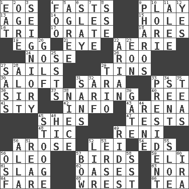 ACROSS 1. Greek goddess of the dawn 4. Goes without food and/or water 9. Shaw product 13. Mature 14. Stares 15. Hollow 16. Three (prefix) 17. Declaim 18. Ancient Greek god of war 19. Oval reproductive body of a fowl 21. Sight organ 22. Nest on high 24. Sense of smell 26. Friend of Pooh 27. Travels by water 29. Airtight sealed metal containers 30. High up in or into the air 31. "Two Mules for Sister ____" 33. Pacific Standard Time (abbr.) 36. Title for a knight 37. Catching in a trap 40. To sift 41. Filthy place 42. A message received and understood 43. Sports stadium 45. "______ My Girl" (Turtles hit) 47. Trials 48. Nervous spasm 49. Painter Guido (1575-1642) 50. Came up 52. Luau accessory 54. Begley and Asner 56. Butter sub 57. Avian creatures 59. Biblical high priest 61. Volcanic refuse 62. Fertile tracts in a desert 63. And not 64. Conductor's collection 65. Take or capture by force 66. Beverage made from leaves DOWN 1. Erode 2. Legendary monster 3. Signiory (variant) 4. Egg _ yung 5. Match 6. Kill 7. Wig 8. Compass dir. 9. N Egypt peninsula 10. Australian parrot (variant) 11. Toward shelter 12. It is so 20. _ course 22. Believer in; advocate of (suffix) 23. A really long time 25. Fast planes 27. Backtalk 28. Came down and settled, as after flight 29. Musical group of three 31. Without 32. Sandy's bark 33. Elected leader of a country 34. Emitted 35. Beverages made from leaves 38. Sibling's daughter 39. Yard entry 44. French philosopher Descartes 45. Moe Howard, for one 46. Part of HMS, perhaps 49. Amusement-park features 50. Silent film actress Nazimova 51. Tail end 52. One who doesn't tell the truth 53. Celtic language 55. A type of plum 56. Order of Saint Francis (abbr.) 57. Arrow shooter 58. Fast jet (abbr.) 60. Retirement account (abbr.)