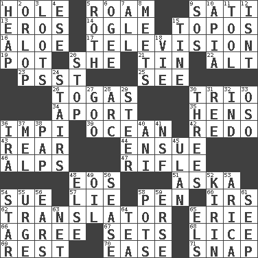 ACROSS 1. Hollow 5. Wander aimlessly 9. Suttee (variant) 13. Greek god of love 14. Stare 15. Traditional theme or motif 16. _ vera 17. Boob tube 19. Cooking vessel 20. A female animal or person 21. Shallow baking pan 22. Keyboard modifier key 23. Inconspicuous attention getter 25. Observe 26. Ancient Roman robes 30. Musical group of three 34. To the left, to Queeg 35. Coop moms 36. Body of Kaffir warriors 39. Sea 42. Make new 43. Bring up, as a child 44. Follow as a consequence or result 46. High mountains 47. Firearm 48. Greek goddess of the dawn 51. "____ silly question..." 54. Take to court 57. Whopper 58. Animal enclosure 60. Big collection agency 62. Interpreter 65. 4th largest of the Great Lakes 66. Match 67. Puts into a specified state 68. Louse (plural) 69. Repose 70. Relaxation 71. Fastener DOWN 1. Pile 2. Fourth or lowest deck 3. Plunders 4. Compass dir. 5. Writer of Portnoy's Complaint (1969) 6. Double curve, resembling the letter S 7. Everything 8. Confronts 9. Mayday 10. Capital of Western Samoa 11. Instrument 12. Is not 15. Prong on a fork 18. Compete 20. Obstruct or block passage 24. Flight of steps 27. Thick or sticky substance 28. Curve 29. Bull 30. Triads 31. Portuguese money of account (variant) 32. Indiana (abbr.) 33. Bear (Spanish) 36. Lyricist Gershwin 37. Cartoonist voice _ Blanc 38. Infant food 40. Cuckoo 41. Overdraft (abbr.) 45. Uhlan (variant) 48. Otherwise 49. Petroleum 50. Gospel singer Marvin 52. Japanese brewing company 53. N. Chile seaport 54. Play the lead 55. Goad 56. Hearing organs 58. Plant holders 59. Celtic language 61. Ooze 63. Remaining after all deductions 64. Beverage made from leaves 65. Raised railways