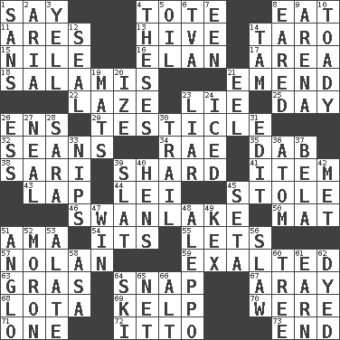 ACROSS 1. Declare 4. Carryall 8. Ingest 11. Ancient Greek god of war 13. Hub of activity 14. Edible starchy tuberous root 15. Mediterranean tributary 16. Liveliness 17. Length times width 18. Deli grouping 21. Make improvements or corrections to 22. Goldbrick 23. Falsehood 25. 24 hours 26. Followers of ems 29. A testis 32. Seines 34. Actress Charlotte 35. Small moist lump or mass 38. Indian skirt 39. Broken piece 41. A whole individual unit 43. Pet locale 44. Flowery wreath 45. Fur scarf 46. Tchaikovsky ballet 50. Floor covering 51. Wet nurse (var.) 54. It is 55. Allows 57. Pitcher Ryan 59. Glorified 63. Pate de foie ____ 64. Fastener 67. Like ___ of sunshine 68. Globular water bottle used in Asia 69. Seaweed 70. Past tense of be (plural) 71. Single 72. "Tell ____ the Marines!" 73. Conclusion DOWN 1. Without 2. Roberta Peters solo 3. Shout 4. College papers 5. Petroleum 6. Federal power corp. 7. Car or cant ending 8. Having ears or earlike features 9. Sports stadium 10. Sycophant 12. Lick closed 14. Scottish cap 19. Floor protectors 20. Ending with capital 21. Snakelike fish 23. One who doesn't tell the truth 24. On the rocks 26. Curvy letter 27. Actress Patricia 28. "Two Mules for Sister ____" 30. Hang back 31. Prepare for publication 33. Cuts off 36. Tiny particle 37. Actor Lugosi 39. Narrow board 40. Coop moms 42. Was introduced to 45. Stalk of a moss capsule 47. Acquire through effort 48. City in Syria 49. A weed 51. White American of non-Hispanic descent 52. Person of subnormal intelligence 53. Having winglike extensions 56. Cole _ (cabbage dish) 58. White ___ sheet 60. Woody plant 61. Merit 62. Colored 64. What Jean-Claude Killy likes to do 65. Fish or hair follower 66. Keyboard modifier key