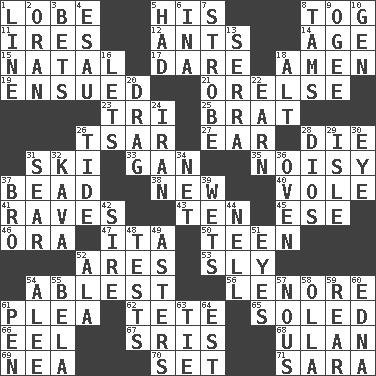 ACROSS 1. Ear part 5. Part of HMS, perhaps 8. Coat; cloak 11. Angers 12. Pismires 14. Personal question 15. Brizilian seaport 17. Have the gumption 18. So be it 19. Followed as a consequence or result 21. Threatening words 23. Three (prefix) 25. Naughty child 26. Russian ruler of old 27. Ewer handle 28. Pass on 31. What Jean-Claude Killy likes to do 33. Separate the seeds from cotton 35. Annoyingly loud 37. Necklace unit 38. ___ Haven, CT 40. Grand slam 41. All-night dance parties 43. "___ Little Indians" 45. Compass dir. 46. Mouth or opening 47. Call ___ day 50. Adolescent 52. Ancient Greek god of war 53. Mischievous 54. Most capable 56. Poe poem 61. Entreaty 62. Wig 65. Having a sole or soles 66. Snakelike fish 67. Indian titles of respect 68. ____ Bator 69. Teachers' org. 70. Put into a specified state 71. "Two Mules for Sister ____" DOWN 1. Actor's bit 2. Northwest Algerian city 3. Antes 4. Son of Isaac 5. Possessed 6. _ tizzy (2 wds.) 7. Disco prop 8. Scottish caps 9. Double curve, resembling the letter S 10. Commissioned mil. rank 13. Father Junipero _ 16. Allows 18. Keyboard modifier key 20. To trail on the ground 22. Merit 24. SW Asia republic 26. Periodic rise and fall of the sea level 28. "Vaya con ____" 29. Small island 30. Sight organ 31. Wither 32. Polynesian shrub of the pepper family 34. Fish or hair follower 36. Baking chamber 37. Sis' sibling 39. Moistens 42. Father 44. 1994 drama film starring Jodie Foster 48. Trials 49. Michaelmas daisies 51. Sight organs 52. Insect wing 54. Toward shelter 55. Actor Lugosi 57. Common sense 58. Water jar 59. Tail end 60. Pulitzer Prize-winning author Ferber 61. Writing instrument 63. Standoff 64. Eastern Standard Time (abbr.)