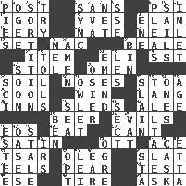 ACROSS 1. Mail 5. Without 9. Air pressure measure (abbr.) 12. Russian composer Stravinsky 13. Jacques Cousteau's middle name 14. Liveliness 15. Suggestive of the supernatural 16. Nathan's nickname 17. Famous astronaut Armstrong 18. Arrange properly for use 19. Big _ 21. Calif. Air Force Base 22. A whole individual unit 24. Biblical high priest 26. Fast jet (abbr.) 27. Took without asking 28. Sign of things to come 29. The visible part of the earth's surface 30. Olfactory organs 32. Portico 36. Calm and collected 37. Victory 38. Austrian-born American filmmaker Fritz 39. Restaurants 40. Bobsleighs 42. Toward shelter 43. Fermented drink made from hops 44. Vices 46. Greek goddess of the dawn 49. Erode 50. Patter 51. Smooth fabric 53. Baseball player Mel 54. Adept person 57. Russian ruler of old 58. Cassini of fashion 61. Narrow board 62. Snakelike fish 63. Lightbulb-shaped fruit 64. Trial 65. Compass dir. 66. Hoop that covers a wheel 67. "____ silly question..." DOWN 1. Sliced desserts 2. Double curve, resembling the letter S 3. Making a chance decision by using lots 4. Attempt 5. Synchronize (abbr.) 6. Actress Gardner 7. Fish or hair follower 8. Compass dir. 9. Entreaties 10. Travels by water 11. An arm off of a larger body of water 14. Compass dir. 19. Cartoonist voice _ Blanc 20. So be it 21. Storage container 23. For Whom the Bell _____ 24. Make improvements or corrections to 25. French article 27. Within a short period 28. Flexible twig of a willow tree 29. _-fi 31. A small or young owl 32. Killed 33. Baron Munchausen's specialties 34. Singles 35. Ripen 40. Ocean 41. Religious group 43. Benjamin's nick name 45. Large container 46. First name in cosmetics 47. Fertile tracts in a desert 48. Having lost freshness 52. Big collection agency 53. Legendary monster 55. Keg 56. Singer James 58. Elect 59. Luau accessory 60. Hearing organ 61. R.R. building