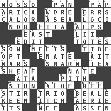 ACROSS 1. With motion or animation 6. Baking dish 9. Infant food 12. N. Chile seaport 13. Had on 14. Blunders 15. Bodily heat indicating an inflammation 16. At sea 17. Locales 18. Not either 19. Singer James 20. High mountains 21. 90 degrees 23. Cards in a Roman deck? 24. Prepare for publication 25. Lugs 28. Boy, to dad 30. Confronts 34. Periodic rise and fall of the sea level 35. Elect 36. Maternal 38. Small island 39. Armed conflicts 41. Excessive but superficial compliments 43. Beverage made from leaves 44. Archer's quiver 46. Nathan's nickname 48. _ moment's notice (2 wds.) 49. Heart or essence 50. Surprise greatly 51. Medicinal plant 53. To separate or throw off 56. Use a swizzle stick 57. Musical group of three 58. Memphis, Tenn. Street 60. Peachy ____! 61. Hankering 62. Nest on high 63. ___ a Wonderful Life 64. Born 65. NE Netherlands city DOWN 1. Apple computer (short form) 2. Northwest Algerian city 3. Grain storage tower 4. Tallied 5. Rowing implement 6. Mail 7. Type of rug 8. Teachers' org. 9. Appease 10. Arches 11. Air pressure measure (abbr.) 13. Electrical Unit 14. American author Paul (1891-1958) 19. First name in cosmetics 20. Keyboard modifier key 22. Direct toward a target or goal 24. Pleas 26. Singer Brickell 27. Bristle 28. Sty mamas 29. Brightly colored fish 31. Followers of ems 32. Scottish cap 33. R.R. building 37. Bert's buddy 40. Titan orbits this 42. Floor protector 45. Avid follower 47. Triads 49. "Silly old bear" 50. Proofreading order 51. Johnson of "Laugh-In" 52. Louse (plural) 54. Hearing organs 55. Writer Wiesel 56. What Jean-Claude Killy likes to do 57. Shallow baking pan 58. Sound made by sheep 59. Car or cant ending