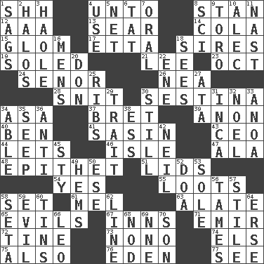 ACROSS 1. Quiet! 4. To (old English) 8. Comedian Laurel of Laurel & Hardy 12. Auto club (abbr.) 13. Burn superficially 14. Root beer relative 15. Take by theft 17. Singer James 18. Begets 19. Having a sole or soles 21. Area sheltered from the wind 23. Sep. follower 24. Sir (Sp.) 26. Teachers' org. 28. In a ____ (agitated or irritated) 30. French poetic form 34. White ___ sheet 37. Cy Young winner Saberhagen 39. Soon (poet.) 40. Benjamin's nick name 41. Indian antelope 43. Corporate head (abbr.) 44. Allows 46. Small island 47. Wing 48. Curse 51. Hats (slang) 54. It is so 55. Plunders 58. Put into a specified state 61. Cartoonist voice _ Blanc 63. Having winglike extensions 65. Vices 67. Lodging establishments 71. Independent ruler or chieftain 72. Prong on a fork 73. Words to Nanette 74. Raised railways 75. In addition 76. Genesis locale 77. Observe DOWN 1. Droops 2. Auras 3. White Person, in Hawaii 4. Purpose 5. Remaining after all deductions 6. Make lace 7. Taken by mouth 8. _-fi 9. "Corrida" creature 10. Actor Baldwin 11. Political cartoonist Thomas 16. Not women's 18. Perceives with the eye 20. Spanish title 22. Compass dir. 25. Chest bones 27. _ moment's notice (2 wds.) 29. Distinguishing feature 30. Free from disturbance or agitation 31. South American Indian 32. Christmas carol 33. Small Philippine buffalo 34. Competent 35. Ooze 36. Against 38. Double-curved letter 42. Famous astronaut Armstrong 45. Filthy place 49. Is hesitant and indecisive 50. Compass dir. 52. ___ good deed 53. Not divided or shared with others 56. Domesticates 57. Vertical member of a panel or frame 58. Bristle 59. Morally bad or wrong 60. Canisters 62. Actor's bit 64. Celtic language 66. Lion 68. Lower and raise head in agreement 69. Compass dir. 70. Male child