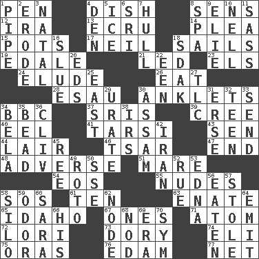 ACROSS 1. Fenced enclosure 4. Food container 8. Elected reps. 12. Lyricist Gershwin 13. Shade of tan 14. Entreaty 15. Cooking vessels 17. Famous astronaut Armstrong 18. Travels by water 19. Peak District village in England 21. Directed 23. Raised railways 24. Evade 26. Ingest 28. He sold his birthright 30. Short socks 34. English channel? 37. Indian titles of respect 39. Algonquian 40. Snakelike fish 41. Tarsus (plural) 43. Elected rep. 44. Den 46. Russian ruler of old 47. Conclusion 48. Contrary to your interests or welfare 51. Female horse 54. Greek goddess of the dawn 55. Unadorned figures 58. Mayday 61. "___ Little Indians" 63. Related on the mother's side 65. Potato state 67. Washington bills 71. Smallest unit of an element 72. Australian parrot (variant) 73. Dinghy 74. Biblical high priest 75. Mouths or openings 76. Dutch treat 77. Remaining after all deductions DOWN 1. Corncob 2. Eat (away) 3. Brizilian seaport 4. Lair 5. Frozen water 6. _ Lanka 7. Frame or body of a ship 8. Health resort 9. Writer Wiesel 10. 1994 drama film starring Jodie Foster 11. Backtalk 16. Turn sharply 18. Neighbor of Neb. 20. Begley and Asner 22. Car or cant ending 25. Compass direction 27. Affectionate concern, for short 29. A salt of uric acid 30. Indian state 31. Celtic language 32. Adolescent 33. Post 34. Actor Lugosi 35. Necklace unit 36. 154 in Roman numerals 38. Big collection agency 42. SW Asia republic 45. To separate or throw off 49. Printing process, for short 50. Compass dir. 52. Regret 53. Pulitzer Prize-winning author Ferber 56. Ingested 57. Took without asking 58. Grain storage tower 59. Aroma 60. "Two Mules for Sister ____" 62. Thickened enlargement 64. Send forth 66. Part of HMS, perhaps 68. Dreamland 69. Epoch 70. Symbol (abbr.)