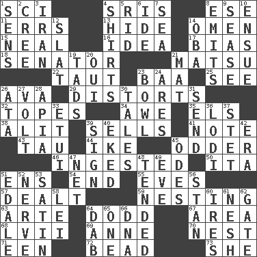 ACROSS 1. _-fi 4. Indian titles of respect 8. Compass dir. 11. Blunders 13. Flintstone garb 14. Sign of something about to happen 15. Anneal 16. The content of cognition 17. Prejudice 18. Legislator 21. Taiwanese island in East China Sea 22. Tense 23. Sound made by sheep 25. Perceive with the eye 26. Actress Gardner 29. What propaganda does 32. Drinks excessively 34. Deep reverence 35. Raised railways 38. Came down and settled, as after flight 39. Makes a sale 41. Short letter 43. The 19th letter of the Greek alphabet 44. D.D.E's nickname 45. More peculiar 46. Consumed 50. Call ___ day 51. Followers of ems 54. Conclusion 55. Nights before holidays 57. Started a card game 59. Inhabiting a nest 63. Johnson of "Laugh-In" 64. Texas town _ City 67. Type of rug 68. 57 in ancient Rome 69. Singer Murray 70. Egg locale 71. Car or cant ending 72. Necklace unit 73. A female animal or person DOWN 1. Elected reps. 2. Algonquian 3. SW Asia republic 4. Upper-body garments 5. To free from 6. Binary compound 7. Ocean 8. Gives off 9. Gospel singer Marvin 10. Take place subsequently 12. Narrow board 14. Chief or king in Benin or Nigeria 19. Small boys 20. Fr. "Yes" 21. Floor covering 23. Soup holder 24. Ancient Greek god of war 26. _ moment's notice (2 wds.) 27. Electrical Unit 28. Capital of Western Samoa 30. Lies 31. Post 33. Needle holder 36. Farming town in central California 37. Proofreading order 39. Public display of a written message 40. Made supply last 42. Period 45. Lyric poems 47. Remaining after all deductions 48. Looked after 49. First lady 51. Peak District village in England 52. Effrontery 53. Smooth fabric 56. Comedian Laurel of Laurel & Hardy 58. Flowery wreath 60. Angers 61. Tender 62. Yard entry 64. Small moist lump or mass 65. Single 66. Heredity factor (abbr.)