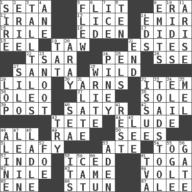 ACROSS 1. Bristle 5. Sudden quick movement 9. Period 12. SW Asia republic 13. Louse (plural) 14. Arab leader 15. Cause heat under the collar 16. Paradise 17. "You Light Up My Life" star Conn 18. Snakelike fish 19. The 23rd letter of the Hebrew alphabet 21. _____ Park, CO 22. Russian ruler of old 24. Fenced enclosure 26. Compass dir. 27. Before Barbara or Clara 28. Rampant 29. _ and Stitch 30. Entertaining tales 32. Detail 36. Butter sub 37. Falsehood 38. Flatfish 39. Mail 40. Letch 42. Move on water 43. Wig 44. Dodge 46. Everything 49. Actress Charlotte 50. Observes 51. Like summer trees 53. Had dinner 54. Coat; cloak 57. _ china 58. On the rocks 61. Ancient Roman robe 62. The longest river in the world 63. Docile 64. Electrical Unit 65. Compass dir. 66. Astound 67. Toward shelter DOWN 1. Beget 2. One of the Great Lakes 3. Baron Munchausen's specialties 4. One (Scot) 5. Soared 6. Flaplike covering 7. Frozen water 8. "___ Little Indians" 9. Sends forth 10. Amusement-park features 11. Originate 14. Begley and Asner 19. Make lace 20. Like ___ of sunshine 21. Conclusion 23. Snout, nose 24. Abounding in pines 25. Raised railways 27. Grain storage tower 28. Compose 29. Trim (branches) 31. Having winglike extensions 32. Come out of 33. Inedible or poisonous agaric 34. Writer Wiesel 35. Cartoonist voice _ Blanc 40. Ocean 41. Respite 43. Attempt 45. Area sheltered from the wind 46. Place in a line 47. Soviet premier 1918-24 48. Dipping utensil 52. Enemy 53. Arabian gulf 55. Stare at amorously 56. Yard entry 58. It is 59. Feline 60. Australian flightless bird 61. Federal power corp.
