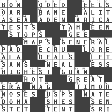 ACROSS 1. Ribbon knot 4. Wrote a lyric poem 8. Snakelike fish 12. Boat paddle 13. Object of repulsion 14. Set down 15. At sea 17. An important port of Yemen 18. N. Chile seaport 19. Trials 21. Scottish cap 23. Car or cant ending 24. Ceases 26. Turn to the right 28. Atlas contents 30. Commissioned military rank 34. Groovy apt. 37. Shade of tan 39. Old wives' tales, e.g. 40. In the manner of 41. Allots cards 43. Allow 44. Without 46. Anneal 47. Curvy letter 48. Having the greatest elevation 51. Island territory of the United States 54. Being at a high temperature 55. Relatively large 58. Epoch 61. Tired old horse 63. The easternmost of the Lesser Sundas 65. Olfactory organs 67. United States Postal Service (abbr.) 71. Nathan's nickname 72. Capital of the state of Qatar 73. "______ My Girl" (Turtles hit) 74. Elected rep. 75. Proofreading order 76. Portable shelter 77. Indian title of respect (Mr.) DOWN 1. Water vessel 2. Fertile tracts in a desert 3. Obtain by seizing forcibly or violently 4. Chief or king in Benin or Nigeria 5. Male parent 6. Compass dir. 7. Gouge 8. Hearing organ 9. Writer Wiesel 10. Louse (plural) 11. Comedian Laurel of Laurel & Hardy 16. Smallest unit of an element 18. So be it 20. Health resort 22. Grow older 25. Moved rapidly 27. Snakelike fish 29. Aroma 30. POW camp 31. Hero or heavy, e.g. 32. Ancient Greek god of war 33. Allows 34. Romantic infatuation 35. Jai _ 36. Mild oath, euphamism for damn 38. Actress Charlotte 42. Strike heavily 45. Quiet! 49. Immeasurably long periods of time 50. R.R. building 52. Tate display 53. Chow _ 56. Collect or gather 57. Carrier 58. Conclusions 59. Carrot, for example 60. American tennis player Robert 62. Abrupt rush of wind 64. Painter Guido (1575-1642) 66. Ingest 68. A female animal or person 69. Animal enclosure 70. Fast jet (abbr.)