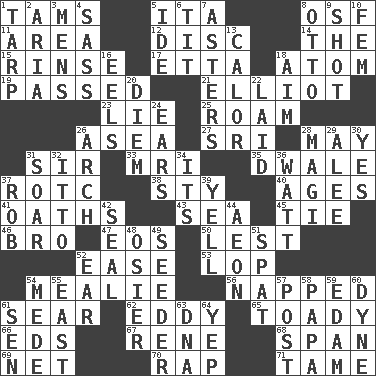 ACROSS 1. Scottish caps 5. Call ___ day 8. Order of Saint Francis (abbr.) 11. Length times width 12. Flat circle 14. Definite Article 15. Remove soap 17. Singer James 18. Smallest unit of an element 19. Went by 21. American author Paul (1891-1958) 23. Whopper 25. Wander aimlessly 26. Toward the sea 27. Indian title of respect (Mr.) 28. Can I? 31. Title for a knight 33. Medical imaging device (abbr.) 35. A sleeping potion; an opiate (poet.) 37. College mil. group 38. Filthy place 40. Matures 41. Curses 43. Ocean 45. Standoff 46. Sis' sibling 47. Greek goddess of the dawn 50. For fear that 52. Comfort 53. Trim (branches) 54. Ear of corn 56. Slept 61. Dry up 62. Whirlpool 65. Sycophant 66. Begley and Asner 67. French philosopher Descartes 68. Connect, as a bridge 69. Fish or hair follower 70. Hit sharply and swiftly 71. Not wild DOWN 1. Canvas cover 2. Operatic vocal solo 3. Not women's 4. Backtalk 5. Binary compound 6. Teat (slang) 7. Michaelmas daisies 8. "Beetle Bailey" pooch 9. Went for two points 10. Opposite of masc. 13. Bodily heat indicating an inflammation 16. Snakelike fish 18. Direct toward a target or goal 20. South Vietnam president (1954) 22. Put down 24. Hearing organs 26. Bowlike part 28. Wise men 29. Toward shelter 30. It is so 31. Fly high 32. "Tell ____ the Marines!" 34. ___ a Wonderful Life 36. Electrical Unit 37. Director Reiner 39. Shout 42. Lick closed 44. Period of immesurable duration 48. Flexible twig of a willow tree 49. Sowing specialist 51. Petty quarrel 52. Hearing organ 54. Ancient Persian 55. Compass direction 57. Mail 58. Dad 59. Dutch treat 60. Centimeter-gram-second unit of force 61. Elected rep. 63. Heredity factor (abbr.) 64. Slangy assent