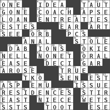 ACROSS 1. Single 4. The main thing one is thinking about 8. Tense 12. Went 14. Team commander 16. Domed church section 17. Grant temporary use of 18. Pleas 20. _____ Park, CO 22. Ewer handle 23. Tate display 24. Observe 25. Globe 28. Personal Computers (abbr.) 30. Of or related to the anus 31. Took without asking 35. Small moist lump or mass 37. Charged atoms 40. Migrant worker of the '30s 41. 1994 drama film starring Jodie Foster 42. Music written for nine 44. Relating to the mouth 45. Relaxation 46. Tenth: prefix 47. Slender fish 48. Came up 50. Loyal 52. Ring climax 54. Elected rep. 55. Eastern Standard Time (abbr.) 58. Viper 61. Australian flightless bird 63. Come out of 65. Dwellings 70. Commotion 71. Compass direction 72. Sibling's daughter 73. Soaks 74. Fast planes 75. A blast of a horn 76. Compass dir. DOWN 1. Stares 2. Trap for birds or small mammals 3. Maternal 4. Frozen water 5. Spanish title 6. Ingest 7. 43,560 square feet 8. Make lace 9. Capital of Western Samoa 10. One who makes use of a thing 11. Trial 13. Compass dir. 15. Pile 19. Arches 21. Boy, to dad 26. Water falling in drops from the sky 27. Vital fluid 29. Moe Howard, for one 30. Most capable 32. Gumbo ingredient 33. One who doesn't tell the truth 34. Snakelike fish 35. Letter starter 36. In addition 38. Compass dir. 39. Religious groups 41. Teachers' org. 43. Hoop that covers a wheel 49. Supplemented with great effort 51. University (slang) 53. Presage 55. First name in cosmetics 56. Sets or collections 57. Laconic 58. Ancient Greek god of war 59. Oceans 60. Inconspicuous attention getter 62. A single undivided whole 64. Compass dir. 66. ___ a Wonderful Life 67. Corporate head (abbr.) 68. Environmental prefix 69. Put into a specified state