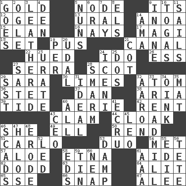 ACROSS 1. Gilt 5. Connecting point 9. It is 12. Double curve, resembling the letter S 13. Mountain range 14. Small Philippine buffalo 15. Flair 16. Negative votes 17. Wise men 18. Put into a specified state 19. Product of festering 21. Lessep's creation 22. Became colored 24. Wedding promise 26. Double-curved letter 27. Spanish missionary in California 28. Native of Scotland 29. "Two Mules for Sister ____" 30. Citrus fruits 32. Smallest unit of an element 36. Proofreading order 37. One of the 12 tribes of Israel 38. Operatic vocal solo 39. Event that recurs at intervals 40. Nest on high 42. Monthly bill 43. Dollar (slang) 44. Cover or conceal 46. A female animal or person 49. Pipe bend 50. Tear apart 51. Monte _, Las Vegas Hotel/Casino 53. Superhero pair 54. Was introduced to 57. Medicinal plant 58. Inactive volcano in Sicily 61. Assistant 62. Texas town _ City 63. South Vietnam president (1954) 64. Set down 65. Compass dir. 66. Fastener 67. Toward shelter DOWN 1. Travels 2. Stare at amorously 3. Resembling or made to resemble leather 4. Lair 5. Religious women 6. Mouth or opening 7. 24 hours 8. Raised railways 9. Lacking in sense or substance 10. Ancient Roman robes 11. Moves on water 14. Housemaid (var.) 19. For each 20. Allodial 21. Small bed 23. A salt of uric acid 24. Ancient Celtic tribe of eastern Britain 25. Two (Sp.) 27. Suttee (variant) 28. Excessive but superficial compliments 29. Fast jet (abbr.) 31. Standard of perfection 32. Composer Copland 33. Excercise machine 34. Pig sound 35. Floor covering 40. Everything 41. Shade of tan 43. Corporate head (abbr.) 45. Lion 46. Loads 47. Auras 48. Eat (away) 52. Directed 53. Moist 55. Singer Brickell 56. Wig 58. Begley and Asner 59. Metal container 60. Teachers' org. 61. Auto club (abbr.)