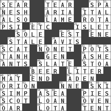 ACROSS 1. Shrivel 5. Lacerate 9. Health resort 12. Tender 13. Operatic vocal solo 14. Slanted text style (abbr.) 15. In addition 16. Unable to walk 17. Round or rotation of duties 18. Air pressure measure (abbr.) 19. And so on (abbr.) 21. Small island 22. Flatfish 24. Eastern Standard Time (abbr.) 26. Compass dir. 27. Lacking originality or spontaneity 28. Deliberation 29. Jazz singing style 30. Music written for nine 32. Cooking vessels 36. Hyperbolic tangent 37. Commissioned mil. rank 38. American tennis player Robert 39. Pismires 40. Chalkboard 42. Portico 43. Fermented drink made from hops 44. 61 cubic inches 46. Floor protector 49. Conclusion 50. An important port of Yemen 51. Greek mythologigal hunter 53. Compass dir. 54. What Jean-Claude Killy likes to do 57. Simple or foolish person 58. At sea 61. Sliced desserts 62. Native of Scotland 63. Grant temporary use of 64. Baking chamber 65. Rowing implement 66. Globular water bottle used in Asia 67. Portable shelter DOWN 1. Fastener 2. Snakelike fish 3. Helper 4. 17th letter of the Greek alphabet 5. Baby powder 6. Period 7. Direct toward a target or goal 8. Actress Charlotte 9. Took without asking 10. Eucharist need 11. Having winglike extensions 14. Big collection agency 19. Pipe bend 20. Adolescent 21. It is 23. Profane or obscene expressions 24. Incident 25. Be seated 27. Skim 28. Approach 29. R.R. building 31. Stared 32. Thick mixture 33. Clearly or manifestly demonstrative 34. Son of Odin 35. Ocean 40. Elected rep. 41. Liveliness 43. Benjamin's nick name 45. Binary compound 46. With motion or animation 47. N. Chile seaport 48. Southeast Indonesia island 52. Elect 53. Grandmother 55. Peachy ____! 56. Is not 58. Everything 59. "Barney Miller" actor Jack 60. Ingest 61. Plant holder