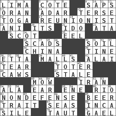 ACROSS 1. Pale green bean 5. ____ d'Azur (French Riviera) 9. Plant excrements 13. Northwest Algerian city 14. The sixth month of the Jewish calendar 15. Laconic 16. Ancient Roman robe 17. One who advocates reunion 19. Cuckoo 20. It is 21. Wedding promise 22. _ moment's notice (2 wds.) 23. Highlander 25. Snakelike fish 26. Heaps 30. Earth 34. Large country 35. Prong on a fork 36. Singer James 39. Shopping centers 42. Mountain range southwest of Kyrgyzstan 43. Lacerate 44. Carrier 46. Crow sounds 47. Showing deterioration from age 48. Cut the grass 51. SW Asia republic 54. Insect wing 57. Ewer handle 58. Compass dir. 60. _ de Janeiro 62. Unrelated to defense, as in spending 65. Fermented drink made from hops 66. Distinguishing feature 67. Oceans 68. South American Indian 69. Drop; flow; fall 70. Pulled tight 71. Highlander DOWN 1. Globular water bottle used in Asia 2. Metal shackles 3. Mysterious quality of enchantment 4. Santa ___, CA 5. Haul 6. Lyric poems 7. The 19th letter of the Greek alphabet 8. Bert's buddy 9. Elected rep. 10. Operatic vocal solo 11. Inconspicuous attention getter 12. Stalk of a moss capsule 15. Utensil 18. Binary compound 20. Hankering 24. Motion picture awards 27. Direct toward a target or goal 28. Heredity factor (abbr.) 29. Table seasonings 30. A viewer who gazes fixedly 31. Petroleum 32. _ tizzy (2 wds.) 33. Flowery wreath 36. And so on (abbr.) 37. Afternoon social gathering 38. The 23rd letter of the Hebrew alphabet 40. Car dealer's back yard 41. R.R. building 45. Writer Wiesel 48. Rendezvous 49. Clumsy lout 50. Take or capture by force 52. Sports stadium 53. Sibling's daughter 54. Pismires 55. Australian parrot (variant) 56. Of or related to the anus 58. He sold his birthright 59. A home for chicks 61. Of the mouth 63. Pass on 64. Teachers' org. 65. Of large size