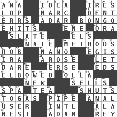 ACROSS 1. Santa ___, CA 4. It may be bright or harebrained 8. Angers 12. Trim (branches) 13. Drug cop 14. Gouge 15. Blunders 17. The sixth month of the Jewish calendar 18. Beat drum 19. Gives off 21. Compass dir. 23. Mouth or opening 24. Schedule 26. Raised railways 28. Nathan's nickname 30. Modes 34. Director Reiner 37. Billionth: prefix 39. Armor plate that protects the chest 40. Lyricist Gershwin 41. Came up 43. Allow 44. Have the gumption 46. Celtic language 47. Begley and Asner 48. Turned at an angle; bent 51. Water jar 54. ___ Haven, CT 55. Exchanges for money 58. Health resort 61. Afternoon social gathering 63. Obscenities 65. Ancient Roman robes 67. Corncob 71. Of or related to the anus 72. One who makes use of a thing 73. International (abbr.) 74. Chicken ___ king 75. Egg locale 76. First of billions? 77. Marina Del _, California DOWN 1. Toward shelter 2. Typical models 3. Showery time 4. _ tizzy (2 wds.) 5. Male parent 6. Period 7. 1/640 square mile 8. Wedding promise 9. Former U.S. Attorney General Janet 10. Engineer (abbr.) 11. Portico 16. Comedian Laurel of Laurel & Hardy 18. Waist strap 20. R.R. building 22. Born 25. Inactive volcano in Sicily 27. A female animal or person 29. Having ears or earlike features 30. With motion or animation 31. Stare at amorously 32. Passed on 33. Fast planes 34. Travel on or in a vehicle 35. Taken by mouth 36. Sharp remark 38. Not either 42. Snakelike fish 45. Period of immesurable duration 49. Moistens 50. She-sheep 52. French article 53. _ mater 56. Type of eclipse 57. Lacking originality or spontaneity 58. Make senseless or dizzy 59. Airs 60. Eons 62. Capital of Western Samoa 64. Kill 66. Nonscientific branch of learning 68. Indiana (abbr.) 69. Parent Teacher Assoc. 70. Shade tree