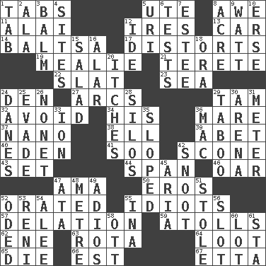 ACROSS 1. Bar bills 5. Shoshoni 8. Deep reverence 11. Mountain range southwest of Kyrgyzstan 12. Angers 13. Auto 14. Greek mezzo-soprano Agnes 17. What propaganda does 19. Ear of corn 21. Cylindrical with tapered ends 22. Narrow board 23. Ocean 24. Lair 27. Curves 29. Scottish cap 32. Prevent from happening 34. Part of HMS, perhaps 36. Female horse 37. Billionth: prefix 38. Pipe bend 39. Collude with 40. Locale of original sin 41. "Barney Miller" actor Jack 42. Biscuitlike quick bread 43. Arrange properly for use 44. Connect, as a bridge 46. Rowing implement 47. Nursemaid (var.) 50. Greek god of love 52. Declaimed 55. Foolish or stupid persons 57. Conveyance 59. Ringlike coral islands and reefs 62. Compass dir. 63. Roll call or roster of names 64. Spoils 65. Pass on 66. Eastern Standard Time (abbr.) 67. Singer James DOWN 1. Bar bill 2. Chicken ___ king 3. Lip ointment 4. Settings 5. RI univ. 6. Trials 7. First name in cosmetics 8. 43,560 square feet 9. Electrical Unit 10. Celtic language 12. Binary compound 15. Vegetable dish 16. Having or resembling wings 18. Mouth or opening 20. Skin irritations 24. Natives or inhabitants of Denmark 25. Elude 26. Music written for nine 28. Grain storage towers 29. Off limits 30. Sports stadium 31. Distance measurement 33. Electrically charged atom 35. Had an oblique or slanted direction 36. Big _ 42. Snout, nose 45. Roberta Peters solo 47. _ moment's notice (2 wds.) 48. Distance measurement (Brit.) 49. Goodbye (Sp.) 51. Fur scarf 52. Wrote a lyric poem 53. Painter Guido (1575-1642) 54. Toward shelter 55. _ tizzy (2 wds.) 56. Groove 58. Baseball player Mel 60. Car dealer's back yard 61. R.R. building