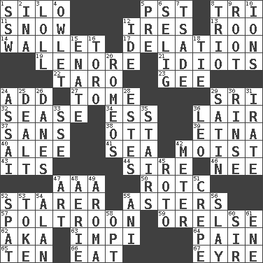ACROSS 1. Grain storage tower 5. Pacific Standard Time (abbr.) 8. Three (prefix) 11. Overwhelm 12. Angers 13. Friend of Pooh 14. Place for singles 17. Accusation by an informer 19. Poe poem 21. Foolish or stupid persons 22. Pacific island yam 23. Unit of force equal to gravity 24. Say or write further 27. Heavy book 29. Indian title of respect (Mr.) 32. Gospel singer Marvin 34. Curvy letter 36. Den 37. Without 38. Baseball player Mel 39. Inactive volcano in Sicily 40. Toward shelter 41. Ocean 42. Damp 43. ___ a Wonderful Life 44. Male parent of an animal 46. Born 47. American Automobile Association (abbr.) 50. College mil. group 52. A viewer who gazes fixedly 55. Michaelmas daisies 57. Characterized by complete cowardliness 59. Threatening words 62. Alias (abbr.) 63. Body of Kaffir warriors 64. Ache 65. "___ Little Indians" 66. Consume 67. Jane of fiction DOWN 1. Compass dir. 2. _ tizzy (2 wds.) 3. Hang loosely or laxly 4. A small or young owl 5. Before (prefix) 6. Former Milwaukee Brewers owner Bud 7. Sadhe (variant) 8. Musical group of three 9. Carrot, for example 10. Charged atoms 12. Binary compound 15. Related on the mother's side 16. "Corrida" creature 18. Standoff 20. Lover boys 24. Slender Brazilian palm 25. Started a card game 26. Natives or inhabitants of Denmark 28. _____ Park, CO 29. Smooth fabric 30. Remove soap 31. Feeling or showing extreme anger 33. Compass dir. 35. Flight of steps 36. Lion 42. Distance measurement 45. Printing process, for short 47. Tate display 48. Nest on high 49. Odor 51. Streamer paper 52. Petty quarrel 53. Puff or smoke 54. Actor Alda or Thicke 55. Cuckoo 56. Kill 58. Choose 60. Title for a knight 61. Compass dir.