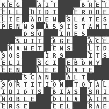 ACROSS 1. Barrel 4. Small island 7. Cy Young winner Saberhagen 11. Pipe bend 12. "You Light Up My Life" star Conn 13. Eat (away) 14. Whopper 15. Arabian gulf 16. Chalkboards 17. Actor Sean's family 19. Aide 21. Bear (Spanish) 23. Angers 24. Set of matching outer garments 25. Ripen 26. Adept person 29. French painter Edouard 30. Followers of ems 31. Hat (slang) 32. Mayday 33. Big collection agency 34. ___ a Wonderful Life 35. Connecticut Ivy Leaguer 36. _-fi 37. Black 40. Car or cant ending 41. Area sheltered from the wind 42. Pace 43. Skim 45. Keyboard modifier key 46. Drawing lots 51. "_____ Recall" 55. Foolish or stupid persons 56. Prejudice 58. Indian title of respect (Mr.) 59. Having high moral qualities 60. Rounded earthenware pot or jar 61. Direct toward a target or goal 62. Celtic language 63. Snakelike fish 64. Actress Charlotte DOWN 1. Seaweed 2. Writer Wiesel 3. Small, secluded valley 4. Assist 5. It may be bright or harebrained 6. Metal containers 7. Naughty children 8. Round or rotation of duties 9. Paradise 10. Trial 12. Hyrax 13. Otherwise 16. Male parents of animals 18. Part of speech 20. Omens 22. Baseball player Mel 24. Indian antelope 25. Nest on high 26. Place in a line 27. Municipality 28. Begley and Asner 29. Undercover agent 32. Perceive with the eye 33. Ancient Celtic tribe of eastern Britain 36. Narrow boards 37. Period 38. Greek mezzo-soprano Agnes 39. "Beetle Bailey" pooch 43. Took without asking 44. Quote 46. Trig term 47. Scent 48. Chest bones 49. Mitch Miller's instrument 50. "Death on the ____" 52. Russian ruler of old 53. Roberta Peters solo 54. Citrus frut 57. Everything