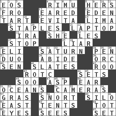 ACROSS 1. Greek goddess of the dawn 4. Tall New Zealand timber tree 8. Possessive pronoun 12. Back 13. Having ears or earlike features 14. Paradise 15. Small pie 17. Webber/Rice musical 18. Pale green bean 19. Paper fasteners 21. Portable computer 23. Retirement account (abbr.) 24. A female animal or person 26. French article 27. Halt 28. One who doesn't tell the truth 30. Biblical high priest 31. Titan orbits this 34. Writing instrument 37. Superhero pair 38. Stay 39. The grampus (Milton) 40. Elected rep. 41. Chalkboards 42. Friend of Pooh 43. College mil. group 44. Arranges properly for use 46. "Barney Miller" actor Jack 47. Cleo's killer 50. Ewer handle 51. Seas 54. Devices for capturing images 57. Pate de foie ____ 58. Derisive sound 60. Grain storage tower 62. Compass direction 63. Portable shelters 64. Small child 65. Snake ____ (dice throw) 66. Observes 67. Put into a specified state DOWN 1. Lizard (obsolete) 2. Mouths or openings 3. Casting lots 4. All-night dance parties 5. From or relating to Ireland 6. Was introduced to 7. Allodial 8. Aide 9. Proofreads 10. San ____ (Riviera town) 11. Fastener 13. Snakelike fish 16. Edible starchy tuberous root 20. Infant food 22. Actor Alda or Thicke 25. Evade 27. Change direction abruptly 29. Angers 30. Begley and Asner 31. Table seasoning 32. Phillipine bananalike plant 33. Teat (slang) 34. Likenesses of persons 35. Greek god of love 36. Non-commissioned officer (abbr.) 41. Within a short period 43. Ridicules or criticizes harshly 44. Observe 45. Hearing organs 46. Gospel singer Marvin 48. Biscuitlike quick bread 49. Pieces 51. Double curve, resembling the letter S 52. Supercomputer manufacturer 53. Fast planes 55. Mountains (abbr.) 56. A type of plum 59. Born 61. Baseball player Mel