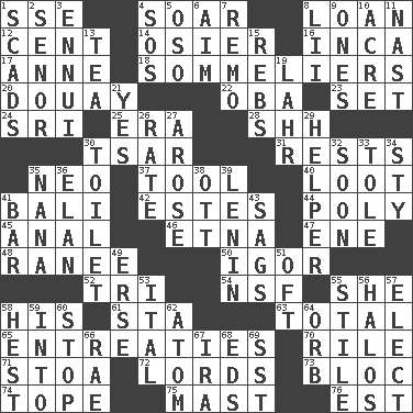 ACROSS 1. Compass dir. 4. Fly high 8. Grant temporary use of 12. Penny 14. Flexible twig of a willow tree 16. South American Indian 17. Singer Murray 18. Wine waiters 20. A city in N France, SE of Calais 22. Chief or king in Benin or Nigeria 23. Arrange properly for use 24. _ Lanka 25. Epoch 28. Quiet! 30. Russian ruler of old 31. Musical pauses 35. Modern: prefix 37. Implement 40. Plunder 41. Indonesian resort city 42. _____ Park, CO 44. More than one (prefix) 45. Of or related to the anus 46. Inactive volcano in Sicily 47. Compass dir. 48. Indian princess (variant) 50. Composer Stravinsky 52. Three (prefix) 54. Science/research agcy. 55. A female animal or person 58. Part of HMS, perhaps 61. R.R. building 63. "_____ Recall" 65. Pleas 70. Cause heat under the collar 71. Portico 72. Domineers 73. Alliance 74. Drink excessively 75. Vertical spar for supporting sails 76. Eastern Standard Time (abbr.) DOWN 1. Heaps 2. Sir (Sp.) 3. World-weariness 4. Mayday 5. Bear (Spanish) 6. Direct toward a target or goal 7. San ____ (Riviera town) 8. Cards in a Roman deck? 9. Washington bills 10. 1/640 square mile 11. Political cartoonist Thomas 13. Afternoon social gathering 15. Confederate soldiers (slang) 19. Cowardly lion portrayer 21. Affirmative reply 26. Assign a rank or rating to 27. Came up 29. Assistant 30. Bathroom plumbing fixture 32. Within a short period 33. Lacquered or enameled metalware 34. Filthy place 35. Nanny 36. Liveliness 38. Baseball player Mel 39. Soviet premier 1918-24 41. Oblong piece of solid material 43. Sinks 49. Celtic language 51. Often (poetically) 53. Slanted text style (abbr.) 55. Vertical member of a panel or frame 56. Rings 57. Voters do this 58. Command 59. To the inside or interior of 60. Halt 62. Tiny particle 64. Globe 66. Actress Charlotte 67. Retirement account (abbr.) 68. Begley and Asner 69. Fast jet (abbr.)