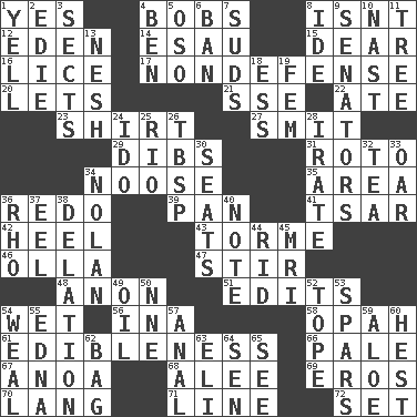 ACROSS 1. It is so 4. Moves up and down 8. Is not 12. Locale of original sin 14. He sold his birthright 15. Letter starter 16. Louse (plural) 17. Unrelated to defense, as in spending 20. Allows 21. Compass dir. 22. Had dinner 23. Upper-body garment 27. Stricken, poetically 29. Rights 31. Printing process, for short 34. Trap for birds or small mammals 35. Length times width 36. Do over again 39. Baking dish 41. Russian ruler of old 42. The bottom of a shoe or boot 43. Singer Mel 46. Rounded earthenware pot or jar 47. Move through with a circular motion 48. At once, immediately (arch.) 51. Proofreads 54. Soggy 56. _ tizzy (2 wds.) 58. Brightly colored fish 61. The property of being fit to eat 66. Light colored 67. Small Philippine buffalo 68. Toward shelter 69. Greek god of love 70. Austrian-born American filmmaker Fritz 71. Actor's bit 72. Put into a specified state DOWN 1. Shout 2. Singer Brickell 3. Religious groups 4. Benjamin's nick name 5. Bear (Spanish) 6. Bar 7. Soap bubbles 8. Binary compound 9. Legislators 10. Political cartoonist Thomas 11. Relationship diagram 13. Tender 18. Curvy letter 19. Opposite of masc. 24. Wedding promise 25. River (Sp.) 26. Cook's measure (abbr.) 28. Feeling or showing extreme anger 30. Theater features 32. Afternoon social gathering 33. Rowing implement 34. Pitcher Ryan 36. 17th letter of the Greek alphabet 37. Snakelike fish 38. Accusation by an informer 40. Brief written record 44. To free from 45. Medical imaging device (abbr.) 49. Petroleum 50. Compass dir. 52. Drink excessively 53. Practice fights 54. Welt 55. Pulitzer Prize-winning author Ferber 57. Of or related to the anus 59. Medicinal plant 60. Behest 62. Paper or plastic container 63. Connecticut Ivy Leaguer 64. Elected rep. 65. Perceive with the eye