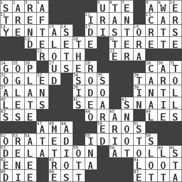 ACROSS 1. "Two Mules for Sister ____" 5. Shoshoni 8. Deep reverence 11. Unclean, religiously 12. SW Asia republic 13. Auto 14. Gossips 17. What propaganda does 19. Keyboard key 21. Cylindrical with tapered ends 22. Writer of Portnoy's Complaint (1969) 23. Epoch 24. Republican Party 27. One who uses or employs something 29. Domesticated feline 32. Stared at amorously 34. Mayday 36. Pacific island yam 37. Actor Alda or Thicke 38. Wedding promise 39. International (abbr.) 40. Allows 41. Ocean 42. Slow-paced one 43. Compass dir. 44. NW Algerian seaport 46. French article 47. Housemaid (var.) 50. Greek god of love 52. Spoke pompously 55. Foolish or stupid persons 57. Conveyance 59. Ringlike coral islands and reefs 62. Compass dir. 63. Round or rotation of duties 64. Spoils 65. Expire 66. Eastern Standard Time (abbr.) 67. Singer James DOWN 1. Filthy place 2. "We ___ not amused" (Victoria) 3. Tear apart 4. Following 5. RI univ. 6. Clothes sense 7. Keyboard key 8. 43,560 square feet 9. Electrical Unit 10. Celtic language 12. Binary compound 15. Verbally 16. Arranges properly for use 18. Mouth or opening 20. College paper 24. Finish lines 25. Stares at amorously 26. Food holder 28. Cowboy competition 29. Lessep's creation 30. Nick name for Arthur 31. For Whom the Bell _____ 33. Followers of ems 35. Flew 36. Shallow baking pan 42. Snob 45. Operatic vocal solo 47. "One Day ___ Time" 48. Distance measurement (Brit.) 49. Goodbye (Sp.) 51. Took without asking 52. Wrote a lyric poem 53. Painter Guido (1575-1642) 54. Toward shelter 55. _ tizzy (2 wds.) 56. Slit 58. Baseball player Mel 60. Car dealer's back yard 61. R.R. building
