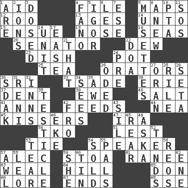 ACROSS 1. Help 4. Do some clerical work 8. Atlas contents 12. Friend of Pooh 13. Grows older 14. To (old English) 15. Follow as a consequence or result 18. Characteristic smell of wine 19. Oceans 20. Legislator 22. Morning condensation 23. Food container 24. Plant holder 25. Beverage made from leaves 26. Speakers 30. _ Lanka 33. Sadhe (variant) 36. 4th largest of the Great Lakes 37. Undesirable depression on a surface 39. She-sheep 40. Table seasoning 41. Queen of England 1702-14 42. Gives food to 44. Teachers' org. 45. Smoochers 47. Retirement account (abbr.) 50. Ring climax 51. For fear that 53. Standoff 54. Orator 57. Actor Baldwin 59. Portico 61. The wife of a rajah (variant) 63. Welt 64. Land elevation 65. Spanish title 66. Old wives' tales, e.g. 67. Conclusions 68. Compass dir. DOWN 1. "We ___ not amused" (Victoria) 2. Charged atoms 3. Administered medicine 4. Papal veil 5. Russian composer Stravinsky 6. French article 7. Compass dir. 8. French bagpipes 9. Afresh 10. Parent Teacher Association (abbr.) 11. Distress signal 16. A single undivided whole 17. Relaxation 21. Not this but _ 22. ___ good deed 24. Before (prefix) 26. Wrote a lyric poem 27. NW Algerian seaport 28. Cause heat under the collar 29. Bristle 30. Neighbor of Neb. 31. Painter Guido (1575-1642) 32. Lodging establishments 34. Perceives with the eye 35. Deep reverence 38. A testis 42. Back 43. Filth; sediment 46. Make supply last 48. Bring up, as a child 49. "____ silly question..." 52. Is inclined (to) 53. Pull apart 54. Exchanged or delivered for money 55. Friends 56. Vintage cars 57. Leather borer 58. Lion 59. A female animal or person 60. Shallow baking pan 62. Compass dir.