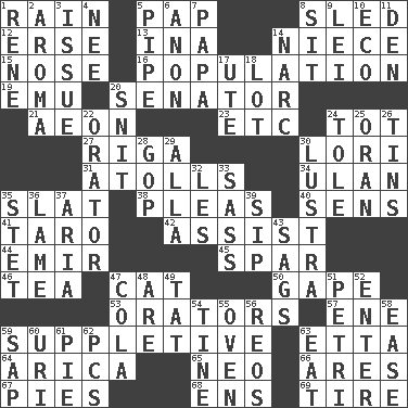 ACROSS 1. Water falling in drops from the sky 5. Infant food 8. Downhill vehicle 12. Celtic language 13. _ tizzy (2 wds.) 14. Sibling's daughter 15. Sense of smell 16. Census information 19. Australian flightless bird 20. Legislator 21. Period of immesurable duration 23. And so on (abbr.) 24. Small child 27. Capital of Latvia 30. Australian parrot (variant) 31. Ringlike coral islands and reefs 34. Uhlan (variant) 35. Narrow board 38. Entreaties 40. Elected reps. 41. Edible starchy tuberous root 42. Aid 44. Arab leader 45. Practice fight 46. Beverage made from leaves 47. Domesticated feline 50. Open wide 53. Speakers 57. Compass dir. 59. Supplying deficiencies 63. Singer James 64. N. Chile seaport 65. Modern: prefix 66. Ancient Greek god of war 67. Sliced desserts 68. Followers of ems 69. Hoop that covers a wheel DOWN 1. French philosopher Descartes 2. Scent 3. Come out of 4. Born 5. Corncob 6. Soon (poet.) 7. Dad 8. Be seated 9. Luau accessory 10. Environmental prefix 11. Lair 14. Drug cop 17. Shoshoni 18. Car dealer's back yard 20. In a ____ (agitated or irritated) 22. Speaker 24. Lacquered or enameled metalware 25. Northwest Algerian city 26. Metal containers 28. Republican Party 29. Silent film actress Nazimova 30. A period of five years 32. French article 33. Backtalk 35. Proofreading order 36. Unable to walk 37. Roberta Peters solo 39. Small drink 43. Droops 47. Root beer relative 48. "We ___ not amused" (Victoria) 49. Make lace 51. _ dish (used to culture cells) 52. Keyboard key 54. Prong on a fork 55. Baking chamber 56. Vintage cars 58. Comfort 59. Plant excrement 60. RI univ. 61. Sliced dessert 62. Personal Computers (abbr.) 63. Consume