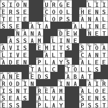 ACROSS 1. The Jewish people; Israel 5. Goad 9. Cards in a Roman deck? 12. Celtic language 13. Calm and collected 14. Coop moms 15. False hair 16. Chops off 17. Of or related to the anus 18. Compass dir. 19. "One Day ___ Time" 21. Place in a line 22. Grandmother 24. Morning condensation 26. Fish or hair follower 27. Indian state 28. Actor's bit 29. Advice 30. Sends forth 32. Portico 36. Not recorded 37. Keyboard modifier key 38. Patter 39. Arabian gulf 40. Live dramatic performances 42. Toward shelter 43. Baby powder 44. For Whom the Bell _____ 46. One (Scot) 49. Begley and Asner 50. Blind as ____ 51. "The Thinker" sculptor 53. _ tizzy (2 wds.) 54. Atmosphere 57. Is not 58. 480, 500 or 516 sheets of paper 61. _ vera 62. Oceans 63. Inventor's middle name 64. Elected reps. 65. Curvy letter 66. Shaw product 67. Inconspicuous attention getter DOWN 1. Arranges properly for use 2. Angers 3. Clearly or manifestly demonstrative 4. Born 5. Southern CA. univ. 6. Friend of Pooh 7. Grand Old Party 8. Raised railways 9. Soviet premier 1918-24 10. Silly 11. Small island 14. Actor Linden 19. Santa ___, CA 20. Docile 21. Deep reverence 23. NE Netherlands city 24. Short, simple song 25. Followers of ems 27. Enthusiastic 28. Pale purple color 29. According to 31. Promenades 32. Any of the three canals of the cochlea 33. Baron Munchausen's specialties 34. Washington bills 35. Had dinner 40. Groovy apt. 41. Comedian Laurel of Laurel & Hardy 43. Nine, plus one 45. Chief or king in Benin or Nigeria 46. Get up 47. Olfactory organs 48. Ferber et al. 52. ___ a Wonderful Life 53. "If ____ say so..." 55. Charged atoms 56. Remainder 58. Strike 59. Pipe bend 60. Actress Gardner 61. Cleo's killer