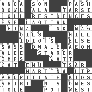 ACROSS 1. Small Philippine buffalo 5. Male child 8. Romantic infatuation 12. Soup holder 13. Chicken ___ king 14. Tarsus (plural) 15. Hang loosely or laxly 16. Homes 19. Compass dir. 20. Of or relating to Laos or its people 21. Inactive volcano in Sicily 23. Indiana (abbr.) 24. Tired old horse 27. Lubricates 30. Land elevation 31. Foolish or stupid persons 34. Otherwise 35. Backtalk 38. A sleeping potion; an opiate (poet.) 40. A really long time 41. Toward shelter 42. A viewer who gazes fixedly 44. Naughty children 45. Electrical Unit 46. Feline 47. Australian flightless bird 50. Russian ruler of old 53. Chrissie's court nemesis 57. Mouth edge 59. Appease 63. Auction offers 64. Chest covering 65. Mountains (abbr.) 66. Washington bills 67. Lacquered or enameled metalware 68. Cooking vessel 69. 270 degrees DOWN 1. Competent 2. Trap for birds or small mammals 3. A small or young owl 4. Everything 5. "Two Mules for Sister ____" 6. Margarine 7. Political cartoonist Thomas 8. Baking dish 9. Curve 10. Compass dir. 11. Part of HMS, perhaps 14. Be inclined (to) 17. One more than two 18. One of the 12 tribes of Israel 20. Put down 22. Annoying sounds 24. The longest river in the world 25. In addition 26. Small, secluded valley 28. Flaplike covering 29. Sty mamas 30. Centers 32. Make lace 33. Cole _ (cabbage dish) 35. Ketch in the Levant 36. _ mater 37. Back-to-school mo. 39. Period 43. Singer James 47. Send forth 48. Floor protector 49. RI univ. 51. Place in a line 52. Amusement-park features 54. Pack (down) 55. "Tell ____ the Marines!" 56. Egg locale 58. Inconspicuous attention getter 59. Pacific Standard Time (abbr.) 60. 17th letter of the Greek alphabet 61. Petroleum 62. Before (prefix) 63. Arrow shooter