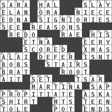 ACROSS 1. "Two Mules for Sister ____" 5. Actor Linden 8. Kill 12. Enthusiasm 13. Mouth or opening 14. Sibling's daughter 15. Pulitzer Prize-winning author Ferber 16. Seigniories (variant) 19. Observe 20. Thinks logically 21. Make new 23. Actress Charlotte 24. Part of HMS, perhaps 27. Inactive volcano in Sicily 30. Suggestive of the supernatural 31. Tallied 34. Dec. holiday 35. Jai ____ 38. Postpone 40. Is not 41. Moves up and down 42. Flight of steps 44. Naughty child 45. Carrot, for example 46. Small island 47. Arrange properly for use 50. Russian ruler of old 53. Chrissie's court nemesis 57. Plant excrement 59. Appease 63. "____ silly question..." 64. Upper-body garment 65. Mountains (abbr.) 66. Adolescent 67. Lacquered or enameled metalware 68. Cooking vessel 69. Extremities DOWN 1. Observes 2. Tree or shrub in the Birch family 3. Indian princess (variant) 4. Santa ___, CA 5. Flexible conduit 6. Roberta Peters solo 7. Straggles 8. Title for a knight 9. Luau accessory 10. Adept person 11. Consenting reply 14. Sense of smell 17. Not either 18. _ tizzy (2 wds.) 20. College mil. group 22. Cease 24. Equivocates 25. SW Asia republic 26. System (abbr.) 28. Dreamland 29. Ancient Greek god of war 30. Is extant 32. Bank Draft (abbr.) 33. Letter starter 35. Swedish rock group 36. Australian parrot (variant) 37. Blind as ____ 39. _ de Janeiro 43. Roll call or roster of names 47. Stricken, poetically 48. Erode 49. Three (prefix) 51. NE Netherlands city 52. Moved through 54. Pack (down) 55. "Tell ____ the Marines!" 56. Egg locale 58. Zero-star reviews 59. Pacific Standard Time (abbr.) 60. 17th letter of the Greek alphabet 61. Lubricate 62. Before (prefix) 63. Had dinner