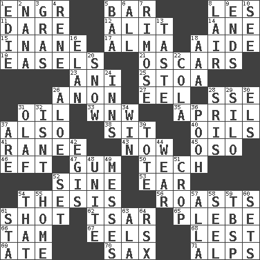 ACROSS 1. Engineer (abbr.) 5. Long, evenly shaped piece 8. French article 11. Have the gumption 12. Set down 14. One (Scot) 15. Empty; void 17. _ mater 18. Assistant 19. Artist's stands 21. Motion picture awards 23. Cuckoo 25. Portico 26. Soon (poet.) 27. Snakelike fish 28. Compass dir. 31. Petroleum 33. Compass dir. 35. Showery time 37. In addition 38. Be seated 40. Lubricates 41. Indian princess (variant) 43. At this time 45. Bear (Spanish) 46. Newt 47. Chewing product 50. Technical work 52. Trig term 53. Ewer handle 54. College paper 56. Cooks with dry heat, as in an oven 61. Opportunity 62. Russian ruler of old 65. First-year military academy student 66. Scottish cap 67. Snakelike fish 68. For fear that 69. Had dinner 70. Saxophone 71. High mountains DOWN 1. Singer Brickell 2. Nanny 3. Pate de foie ____ 4. French philosopher Descartes 5. Sound made by sheep 6. Everything 7. Full of chinks, cracks, or crevices 8. Den 9. Extremities 10. Perceive with the eye 13. Clothes sense 16. Flair 18. Auto club (abbr.) 20. Frozen precipitation 22. Root beer relative 24. Taverns 26. _ vera 28. Indian titles of respect 29. Grain storage tower 30. Raised railways 31. Norwegian king 32. Is not 34. Acquire through effort 36. "Silly old bear" 37. "We ___ not amused" (Victoria) 39. Carryall 42. Armor plate that protects the chest 44. Put on (as clothing) 48. Join together 49. Makes clutter 51. Riding implement 52. Put into a specified state 54. Not this but _ 55. Residence 57. Silent film actress Nazimova 58. Sew up the eyelids of hawks and falcons 59. Cook's measure (abbr.) 60. Puts into a specified state 61. R.R. building 63. Insect wing 64. Acura sports coupe