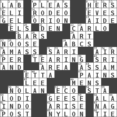 ACROSS 1. Experiment locale 4. Entreaties 9. Possessive pronoun 13. Biblical high priest 14. Cowboy competition 15. Nights before holidays 16. Set 17. Greek mythologigal hunter 18. Assistant 19. Raised railways 21. Lair 22. Monte _, Las Vegas Hotel/Casino 24. Drinking establishments 26. Nonscientific branch of learning 27. Trap for birds or small mammals 29. Lettered men learn these first 30. Collect or gather 31. Indian skirt 33. Wind 36. For each 37. Pulling into pieces 40. _ Lanka 41. Added to 42. Type of rug 43. Indian state 45. Singer James 47. Aches 48. Area sheltered from the wind 49. Not women's 50. Pitcher Ryan 52. Environmental prefix 54. R.R. building 56. Farming town in central California 57. Honkers 59. Insect wing 61. Southeast Asian peninsula 62. Ascend 63. Tired old horse 64. Mail 65. Thermoplastic polyamide 66. Make a knot DOWN 1. Part of a journey 2. Toward shelter 3. Big road sign 4. Adept person 5. Titled peers of a realm 6. Singer Brickell 7. A really long time 8. Boy, to dad 9. Centers of feelings and intuitions 10. Tending to cause great harm 11. Make new 12. Compass dir. 20. Backtalk 22. Apartment or room in a ship 23. Curve 25. Respite 27. California wine valley 28. Sign of things to come 29. Operatic vocal solo 31. "Two Mules for Sister ____" 32. "We ___ not amused" (Victoria) 33. Helper 34. SW Asia republic 35. Basketball hoops 38. Consumed 39. Yawn 44. Without 45. American author Paul (1891-1958) 46. Beverage made from leaves 49. With motion or animation 50. Words to Nanette 51. Probability 52. Suggestive of the supernatural 53. To provide with a ceiling 55. Jai ____ 56. Mouth edge 57. Separate the seeds from cotton 58. Car or cant ending 60. Personal question