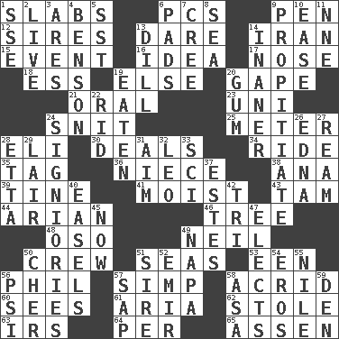 ACROSS 1. Thick slices 6. Personal Computers (abbr.) 9. Writing instrument 12. Founders of families 13. Have the gumption 14. SW Asia republic 15. Incident 16. It may be bright or harebrained 17. Olfactory organ 18. Curvy letter 19. Otherwise 20. Stare wonderingly 21. Of the mouth 23. Corn or form start 24. In a ____ (agitated or irritated) 25. Distance measurement 28. Biblical high priest 30. Allots cards 34. Travel on or in a vehicle 35. Label 36. Sibling's daughter 38. Santa ___, CA 39. Prong on a fork 41. Damp 43. Scottish cap 44. Believer in; advocate of (suffix) 46. Family _ (genealogy) 48. Bear (Spanish) 49. Famous astronaut Armstrong 50. Group working together 51. Oceans 53. Car or cant ending 56. Silvers or Donahue 57. Simple or foolish person 58. Bitter 60. Observes 61. Operatic vocal solo 62. Took without asking 63. Big collection agency 64. For each 65. NE Netherlands city DOWN 1. Compass dir. 2. Not recorded 3. Ancient Greek god of war 4. Gillaume's butler role 5. Fast jet (abbr.) 6. Groovy apts. 7. Algonquian 8. Ocean 9. Conciliate 10. Comfort 11. Compass dir. 13. Deli pickle 14. Sillier 19. Eroded 20. Chewing product 22. To free from 24. Seigniories (variant) 26. Pulitzer Prize-winning author Ferber 27. 480, 500 or 516 sheets of paper 28. Singer James 29. Den 31. Direct toward a target or goal 32. Lion 33. _-fi 37. _____ Park, CO 40. Artist's stands 42. Three (prefix) 45. Immediately 47. Opts 49. California wine valley 50. "Mermaids" star 51. Beget 52. Arab leader 54. Greek god of love 55. Mediterranean tributary 56. 23rd letter of the Greek alphabet 57. Plant excrement 58. White ___ sheet 59. Lair