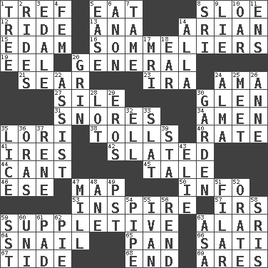 ACROSS 1. Not kosher 5. Consume 8. A type of plum 12. Travel on an animal 13. Santa ___, CA 14. Believer in; advocate of (suffix) 15. Dutch treat 16. Wine waiters 19. Snakelike fish 20. Commissioned military rank 21. Dry up 23. Lyricist Gershwin 24. Nanny (var.) 27. Drop; flow; fall 30. Small, secluded valley 31. Sounds asleep 34. So be it 35. Australian parrot (variant) 38. For Whom the Bell _____ 40. Pace 41. Angers 42. Scheduled 44. Patter 45. Falsehood 46. Compass dir. 47. Atlas unit 50. Information 53. Stimulate to action 57. Big collection agency 59. Supplying deficiencies 63. Having or resembling wings 64. Slow-paced one 65. Baking dish 66. Suttee (variant) 67. Event that recurs at intervals 68. Conclusion 69. Ancient Greek god of war DOWN 1. Family _ (genealogy) 2. Amusement-park features 3. Peak District village in England 4. Opposite of masc. 5. Comfort 6. At once, immediately (arch.) 7. Not wild 8. _ Lanka 9. Untruth 10. Rowing implement 11. Followers of ems 14. Silent film actress Nazimova 17. Medical imaging device (abbr.) 18. Hearing organ 20. Smile widely 22. Help 24. _ mater 25. Confront 26. Queen of England 1702-14 28. Car dealer's back yard 29. Greek god of love 30. Place where plants grow 32. Pipe bend 33. Narrow board 35. Louse (plural) 36. Mouths or openings 37. French philosopher Descartes 39. R.R. building 43. Writer Wiesel 47. Place where flour is made 48. One (Scot) 49. Pacific Standard Time (abbr.) 51. Of or pertaining to a thread or threads 52. Speak pompously 54. Corncob 55. "Terrible" tsar 56. Tear apart 58. Indian titles of respect 59. Fast jet (abbr.) 60. Corn or form start 61. Writing tablet 62. Sliced dessert 63. White ___ sheet