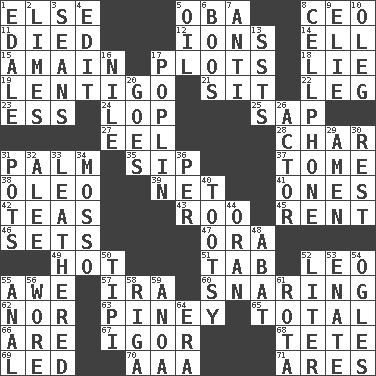 ACROSS 1. Otherwise 5. Chief or king in Benin or Nigeria 8. Corporate head (abbr.) 11. Passed on 12. Charged particles 14. Pipe bend 15. With great haste 17. Schemes 18. Whopper 19. Small, flat, pigmented spot on the skin 21. Be seated 22. Part of a journey 23. Double-curved letter 24. Trim (branches) 25. Plant excrement 27. Snakelike fish 28. Burn to charcoal 31. Inside of hand 35. Small drink 37. Heavy book 38. Butter sub 39. Fish or hair follower 41. Washington bills 42. Beverages made from leaves 43. Friend of Pooh 45. Monthly bill 46. Puts into a specified state 47. Mouth or opening 49. Being at a high temperature 51. Keyboard key 52. Lion 55. Deep reverence 57. Lyricist Gershwin 60. Catching in a trap 62. Not either 63. Abounding in pines 65. Add up to 66. "We ___ not amused" (Victoria) 67. Composer Stravinsky 68. False hair 69. Directed 70. American Automobile Association (abbr.) 71. Ancient Greek god of war DOWN 1. Peak District village in England 2. Citrus fruits 3. Seines 4. Prepare for publication 5. Petroleum 6. Expressions of contempt or scorn 7. Against 8. Portable communications device 9. Writer Wiesel 10. Cassini of fashion 13. Fast planes 16. "Death on the ____" 17. Cotton for raincoats, e.g. 20. Travels 26. Thespian 29. So be it 30. Repose 31. Plant holders 32. Toward shelter 33. Resembling or made to resemble leather 34. With motion or animation 36. For each 40. A girl or young woman (variant) 44. NW Algerian seaport 48. Blind as ____ 50. Native american tent (variation) 52. 61 cubic inches 53. Maternal 54. Stares at amorously 55. Of or related to the anus 56. Had on 58. Port city in Latvia 59. Small Philippine buffalo 61. Roll call or roster of names 64. Epoch