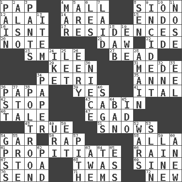 ACROSS 1. Infant food 4. Shopping center 8. The Jewish people; Israel 12. Mountain range southwest of Kyrgyzstan 14. Type of rug 15. Inside; within (prefix) 16. Is not 17. Dwellings 20. Observe 21. Obsolete 22. Binary compound 23. Grin 27. Necklace unit 29. Peachy ____! 31. Ancient Persian 34. _ dish (used to culture cells) 35. Singer Murray 36. Dad 39. It is so 41. Slanted text style (abbr.) 42. Cease 43. Small house or cottage 46. Story 47. Mild oath 48. Loyal 51. Frozen precipitation (plural) 54. Slender fish 56. Reproach for some lapse or misdeed 58. Silent film actress Nazimova 61. Appease 66. Precipitation 67. Portico 68. It was, poetically 69. Trig term 70. Transmit 71. Cloth borders 72. ___ Haven, CT DOWN 1. Ache 2. In addition 3. Leg coverings 4. Make imperfect 5. "We ___ not amused" (Victoria) 6. French article 7. Put down 8. Elected rep. 9. Happening 10. Wrote a lyric poem 11. Olfactory organ 13. Detail 18. Small moist lump or mass 19. She-sheep 24. Mamie's mate 25. Allow 26. Suggestive of the supernatural 28. At full speed 30. Sibling's daughter 32. Heredity factor (abbr.) 33. Snakelike fish 34. Some stationery 36. Pacific Standard Time (abbr.) 37. _ moment's notice (2 wds.) 38. Coward 40. Sinks 44. Forbid 45. Wedding promise 49. RI univ. 50. Consume 52. Armed conflicts 53. Killed 54. Global Positioning Systems (abbr.) 55. Johnson of "Laugh-In" 57. Heart or essence 59. Actor's bit 60. Afresh 62. Writing tablet 63. Deep reverence 64. Scottish cap 65. Curvy letter