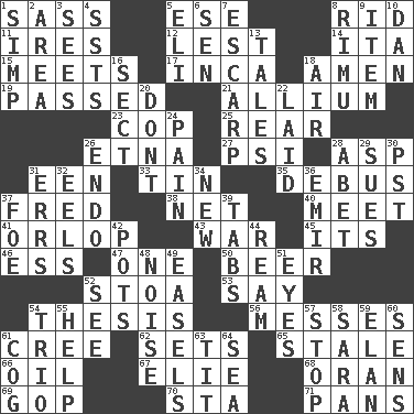 ACROSS 1. Backtalk 5. Compass dir. 8. To free from 11. Angers 12. For fear that 14. Call ___ day 15. Confronts 17. South American Indian 18. So be it 19. Went by 21. Plant genus of onion and garlic 23. Police officer (slang) 25. Hitchcock's "____ Window" 26. Inactive volcano in Sicily 27. Air pressure measure (abbr.) 28. Cleo's killer 31. Car or cant ending 33. Shallow baking pan 35. Alight from a bus 37. Flintstone 38. Fish or hair follower 40. Confront 41. Lowest deck of a ship 43. Armed conflict 45. It is 46. Curvy letter 47. Single 50. Fermented drink made from hops 52. Portico 53. Declare 54. College paper 56. Makes clutter 61. Algonquian 62. Puts into a specified state 65. Lacking originality or spontaneity 66. Lubricate 67. Writer Wiesel 68. NW Algerian seaport 69. Grand Old Party 70. R.R. building 71. Baking dishes DOWN 1. Simple or foolish person 2. Type of rug 3. Perceives with the eye 4. Fast planes 5. Biblical high priest 6. Elected rep. 7. Fortification 8. Tall New Zealand timber tree 9. A distinct part 10. One of the 12 tribes of Israel 13. Falsehoods 16. Religious group 18. Wind 20. Do not 22. Put down 24. Ache 26. Inside; within (prefix) 28. Collude with 29. Takes to court 30. Pacific Standard Time (abbr.) 31. Blunders 32. Snakelike fish 34. ___ Haven, CT 36. Independent ruler or chieftain 37. Enemy 39. Bar bills 42. Cooking vessels 44. 480, 500 or 516 sheets of paper 48. Annoying sound 49. Artist's stands 51. Sight organs 52. Perceive with the eye 54. Musical group of three 55. Assist 57. Halt 58. "Two Mules for Sister ____" 59. Liveliness 60. Elected reps. 61. Gear tooth 63. Teat (slang) 64. Ocean