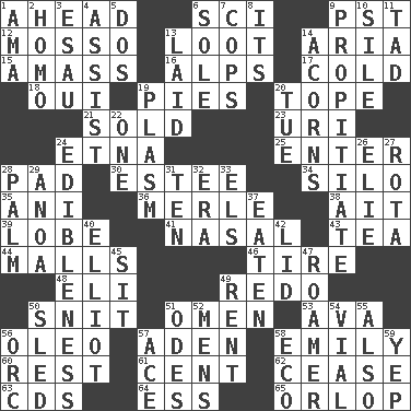 ACROSS 1. Having the leading position 6. _-fi 9. Pacific Standard Time (abbr.) 12. With motion or animation 13. Plunder 14. Roberta Peters solo 15. Collect or gather 16. High mountains 17. Having a low temperature 18. Fr. "Yes" 19. Sliced desserts 20. Drink excessively 21. Disposed of to a purchaser 23. RI univ. 24. Inactive volcano in Sicily 25. Keyboard key 28. Groovy apt. 30. First name in cosmetics 34. Grain storage tower 35. Cuckoo 36. Haggard of country music 38. Small island 39. Ear part 41. Rhinal 43. Afternoon social gathering 44. Shopping centers 46. Hoop that covers a wheel 48. Connecticut Ivy Leaguer 49. Redecorate 50. In a ____ (agitated or irritated) 51. Sign of something about to happen 53. Actress Gardner 56. Butter sub 57. Arabian gulf 58. Poet Dickinson 60. State of inaction 61. Penny 62. Desist 63. Music discs 64. Curvy letter 65. Lowest deck of a ship DOWN 1. Housemaid (var.) 2. Like (prefix) 3. He sold his birthright 4. Aid 5. Two (Sp.) 6. Not divided or shared with others 7. 911 reaches them 8. It is 9. Conciliate 10. Filth; sediment 11. Small amount or degree 13. Put down 14. Oak nuts 19. Suffix with ecto or cyto 20. Third day of the wk. 22. Single 24. The property of being fit to eat 26. Writer Wiesel 27. Roll call or roster of names 28. Inside of hand 29. Small Philippine buffalo 31. "___ Little Indians" 32. Period 33. Raised railways 37. Consumed 40. American author Paul (1891-1958) 42. Flaplike covering 45. Be seated 47. Nomad 49. Monthly bill 50. Downhill vehicle 51. Lyric poems 52. Not women's 54. Small bottle 55. In addition 56. The grampus (Milton) 57. Adept person 58. Environmental prefix 59. Slangy assent