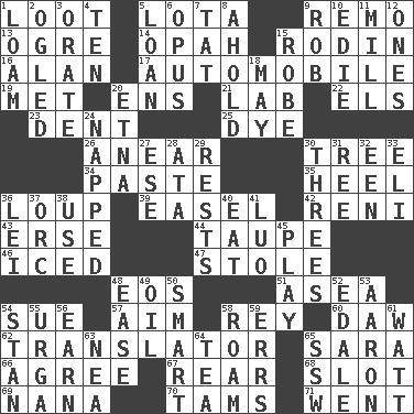 ACROSS 1. Plunder 5. Globular water bottle used in Asia 9. San ____ (Riviera town) 13. Legendary monster 14. Brightly colored fish 15. "The Thinker" sculptor 16. Actor Alda or Thicke 17. Form of transportation 19. Was introduced to 20. Followers of ems 21. Experiment locale 22. Raised railways 23. Gouge 25. Color 26. Approach 30. Family _ (genealogy) 34. Thick mixture 35. Person who is morally reprehensible 36. Central Nebraska county 39. Artist's stand 42. Painter Guido (1575-1642) 43. Celtic language 44. Grayish beige 46. On the rocks 47. Fur scarf 48. Greek goddess of the dawn 51. At sea 54. Institute legal proceedings 57. Direct toward a target or goal 58. Marina Del _, California 60. Simpleton 62. Interpreter 65. "Two Mules for Sister ____" 66. Match 67. Bring up, as a child 68. Position in a hierarchy or organization 69. Grandmother 70. Scottish caps 71. Gone DOWN 1. Rich soil 2. Stared 3. Speak pompously 4. Nine, plus one 5. Grant temporary use of 6. Musical composition 7. Make lace 8. Hold, grip (Informal) 9. Director Reiner 10. Singer Brickell 11. Place where flour is made 12. Washington bills 15. Loose flowing garment 18. Fifth month 20. Inactive volcano in Sicily 24. Slept 27. Compass dir. 28. _ moment's notice (2 wds.) 29. Musical pauses 30. Trios 31. Portuguese money of account (variant) 32. Car or cant ending 33. Biblical high priest 36. Flowery wreath 37. The grampus (Milton) 38. Purpose 40. Ingest 41. Nilotic language 45. Romp 48. Relaxation 49. Petroleum 50. Don Adams' spy role 52. Peak District village in England 53. Composer Copland 54. Comedian Laurel of Laurel & Hardy 55. Capital and largest city of Mongolia 56. Merit 58. Wander aimlessly 59. Blunders 61. Electrical Unit 63. Teachers' org. 64. Afternoon social gathering 65. Compass dir.