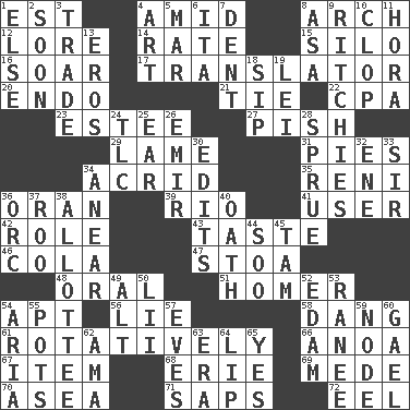 ACROSS 1. Eastern Standard Time (abbr.) 4. Among 8. Bowlike part 12. Old wives' tales, e.g. 14. Pace 15. Grain storage tower 16. Fly high 17. Interpreter 20. Inside; within (prefix) 21. Standoff 22. Tax preparer (abbr.) 23. First name in cosmetics 27. Expression of disdain 29. Unable to walk 31. Sliced desserts 34. Sour-tasting 35. Painter Guido (1575-1642) 36. Northwest Algerian city 39. _ de Janeiro 41. One who makes use of a thing 42. Hero or heavy, e.g. 43. Clothes sense 46. Root beer relative 47. Portico 48. Relating to the mouth 51. Home run 54. Fitting 56. Falsehood 58. Mild oath, euphamism for damn 61. Rotating or pertaining to rotation 66. Small Philippine buffalo 67. A distinct part 68. 4th largest of the Great Lakes 69. Ancient Persian 70. Toward the sea 71. Plant excrements 72. Snakelike fish DOWN 1. Otherwise 2. Within a short period 3. Exchange 4. Nonscientific branch of learning 5. Spoil 6. Call ___ day 7. Gouge 8. White ___ sheet 9. Actors Guy, Robert Welles, and Clint 10. Hoof sound 11. Israeli folk dance 13. Greek god of love 18. Small drink 19. Flowery wreath 24. Affectionate concern, for short 25. Ewer handle 26. Independent ruler or chieftain 28. Upset 30. Prepares for publication 32. Compass dir. 33. Title for a knight 34. Approach 36. The grampus (Milton) 37. Friend of Pooh 38. One to whom something is allotted 40. Pledge 44. "Barney Miller" actor Jack 45. Scottish cap 49. The first octave above the treble staff 50. Cards in a Roman deck? 52. Dutch treat 53. The wife of a rajah (variant) 54. Operatic vocal solo 55. Cooking vessels 57. Nights before holidays 59. Thickened enlargement 60. Highlander 62. Nanny (var.) 63. Epoch 64. Mouth edge 65. Consenting reply