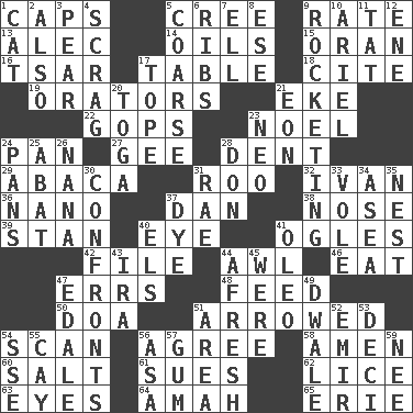 ACROSS 1. Smile enhancers 5. Algonquian 9. Assign a rank or rating to 13. Actor Baldwin 14. Lubricates 15. NW Algerian seaport 16. Russian ruler of old 17. Eating place 18. Quote 19. Speakers 21. Supplement with great effort 22. Republicans 23. Christmas carol 24. Baking dish 27. Unit of force equal to gravity 28. Undesirable depression on a surface 29. Phillipine bananalike plant 31. Friend of Pooh 32. "Terrible" tsar 36. Billionth: prefix 37. Daniel's nick name 38. Olfactory organ 39. Comedian Laurel of Laurel & Hardy 40. Sight organ 41. Stares 42. Do some clerical work 44. Leather borer 46. Consume 47. Blunders 48. Nourish 50. ___ good deed 51. Moved like an arrow 54. Examine hastily 56. Match 58. So be it 60. Table seasoning 61. Takes to court 62. Louse (plural) 63. Snake ____ (dice throw) 64. Nursemaid 65. One of the Great Lakes DOWN 1. Feline 2. In addition 3. Lightbulb-shaped fruit 4. Strangle with an iron collar 5. Unrefined 6. Chest bones 7. Pipe bend 8. Compass dir. 9. Shooting up abruptly 10. Satellite of Uranus 11. Make lace 12. Compass dir. 17. Drink excessively 20. Ancient Roman robe 21. Period of immesurable duration 23. Modern: prefix 24. Baking dishes 25. Blind as ____ 26. Grandmother 28. Spanish title 30. Meets 31. Actress Charlotte 33. Grand slam 34. At sea 35. A home for chicks 37. Color 40. Raised railways 41. Butter sub 43. Retirement account (abbr.) 44. Anew 45. We are 47. Peak District village in England 49. A sleeping potion; an opiate (poet.) 51. Length times width 52. Independent ruler or chieftain 53. Tenth: prefix 54. Compass dir. 55. Island 56. White ___ sheet 57. Chewing product 59. Born